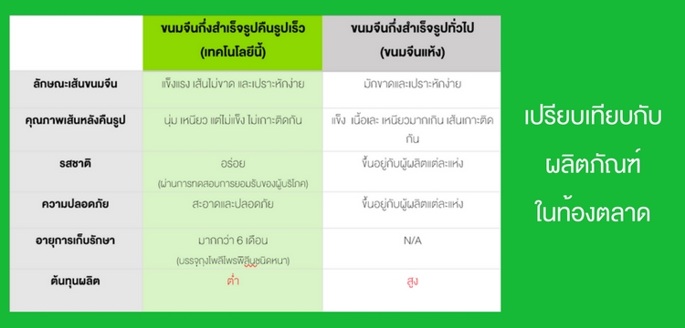 “ขนมจีนกึ่งสำเร็จรูปคืนรูปเร็ว” ได้รับการพัฒนาคิดค้นโดยปรับปรุงกระบวนการผลิตขนมจีนแห้งที่จำหน่ายอยู่เดิมให้มีคุณภาพดีขึ้น โดยเส้นขนมจีนถูกพัฒนาให้มีความแข็งแรง ไม่ขาดและเปราะหักง่าย สามารถคืนรูปได้เร็ว และหลังคืนรูปได้เส้นขนมจีนที่มีลักษณะนุ่ม เหนียว เส้นไม่แข็ง ลดข้อจำกัดของขนมจีนชนิดกึ่งสำเร็จรูปแบบเดิม ทำให้ได้ขนมจีนที่สะดวกต่อการบริโภคที่มีรสชาติอร่อย เก็บรักษาได้นาน น้ำหนักเบา สะดวกต่อการขนส่ง พร้อมจำหน่ายทั้งในและต่างประเทศ