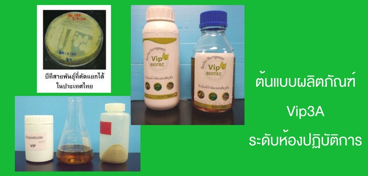 “Vip BIOTEC” สูตรชีวภัณฑ์กำจัดแมลงศัตรูพืชที่มีประสิทธิภาพสูง โดยการใช้โปรตีน Vip3A จากแบคทีเรียบีทีสายพันธุ์ที่พบในประเทศไทย เมื่อทดสอบประสิทธิภาพตั้งแต่ระดับห้องปฏิบัติการ โรงเรือน และในแปลงเปิดขนาดใหญ่ของเกษตรกร เช่น แปลงคะน้า นาข้าว แปลงหน่อไม้ฝรั่ง และแปลงหอมแดง พบว่าสามารถควบคุมแมลงศัตรูพืชได้ดีมากในทุกแปลงทดสอบ ได้ผลผลิตเทียบเท่ากับการใช้สารเคมี และยังออกฤทธิ์เสริมกับชีวภัณฑ์อื่น ๆ เช่น ไวรัสเอนพีวี ราบิวเวอเรีย