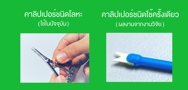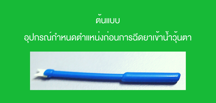 “อุปกรณ์กําหนดตําแหน่งก่อนการฉีดยาเข้าน้ำวุ้นตา (Disposable Caliper)” เป็นคาลิปเปอร์ปราศจากเชื้อชนิดใช้ครั้งเดียว ผลิตจากวัตถุดิบภายในประเทศ ใช้ต้นทุนต่ำ เพื่อทดแทนการใช้คาลิปเปอร์ชนิดโลหะที่มีราคาสูง ได้รับการพัฒนาและออกแบบให้มีลักษณะแบน เป็น 2 แฉก มีขนาด 3.0 และ 4.0 มิลลิเมตร มีส่วนนูนอยู่ระหว่างก้านและปลายแฉกเพื่อเพิ่มความแข็งแรงของส่วนแฉก ก้านมีลักษณะตรงและกลม ส่วนด้ามจับ มีลักษณะกลมมน มีรอยบากเล็กน้อย เพื่อให้จับได้ถนัดมือ ซึ่งเป็นอุปกรณ์ทดแทนเพื่อช่วยลดค่าใช้จ่ายในการซื้ออุปกรณ์ทางจักษุแพทย์ และส่งเสริมการผลิตและพัฒนาวัสดุอุปกรณ์ทางการแพทย์ในประเทศให้เติบโตมากยิ่งขึ้น