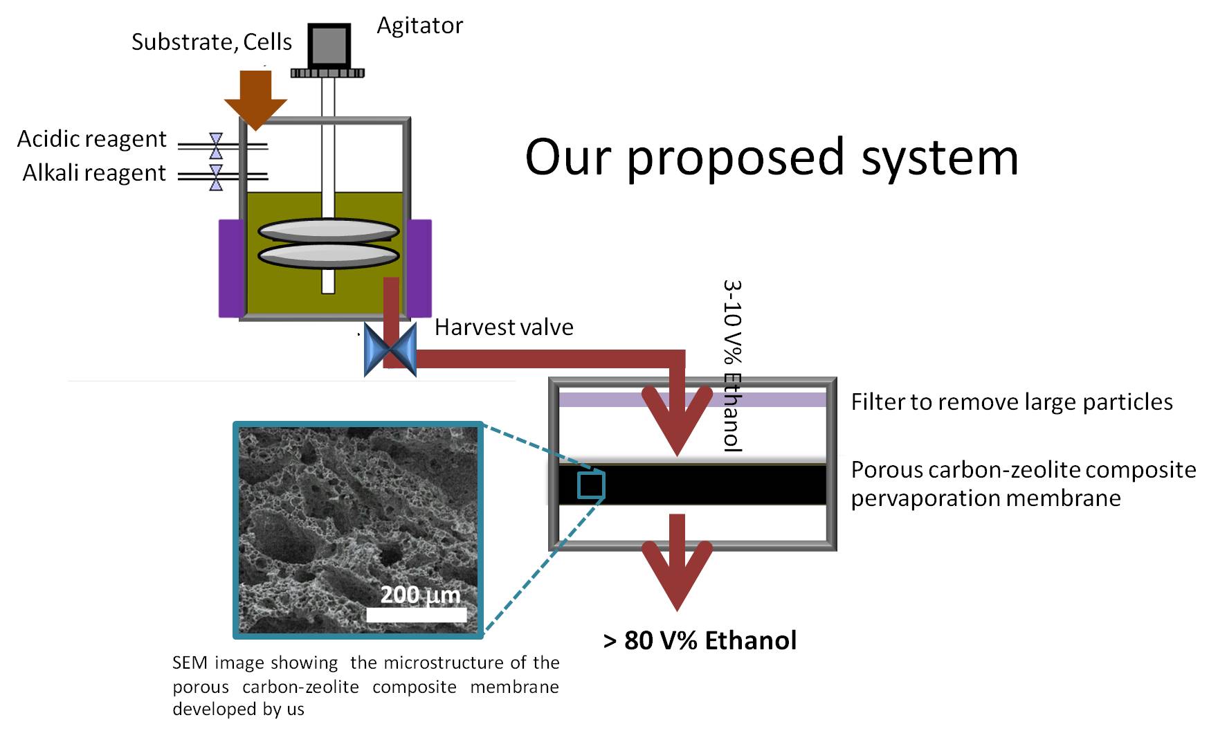 “Carbon-zeolite composites” ได้ถูกพัฒนาคิดค้นขึ้นเป็นเมมเบรนชนิดใหม่สำหรับใช้แยกไบโอเอทานอล มีประสิทธิภาพในการแยกและเสถียรภาพสูง สามารถใช้ซ้ำและมีอายุการใช้งานนาน ผลิตจากวัตถุดิบชีวมวล (biomass based precursors) ได้แก่ lignin, cellulose และ alginate ซึ่งอยู่ในกระบวนการผลิตของโรงงานที่ต้องการแยกไบโอทานอลอยู่แล้ว เช่น โรงงานน้ำตาล ทำให้ช่วยประหยัดค่าใช้จ่ายเพิ่มขึ้นอีก Carbon-zeolite composites ที่พัฒนาขึ้นสามารถใช้ทดแทนเมมเบรนชนิดเดิมที่ใช้อยู่ทั่วไป โดยสามารถแยกไบโอเอทานอลได้บริสุทธิ์มากกว่า 80% จากระบบหมัก โดยใช้กำลังปั๊มที่ต่ำและไม่ต้องผ่านกระบวนการการกลั่น