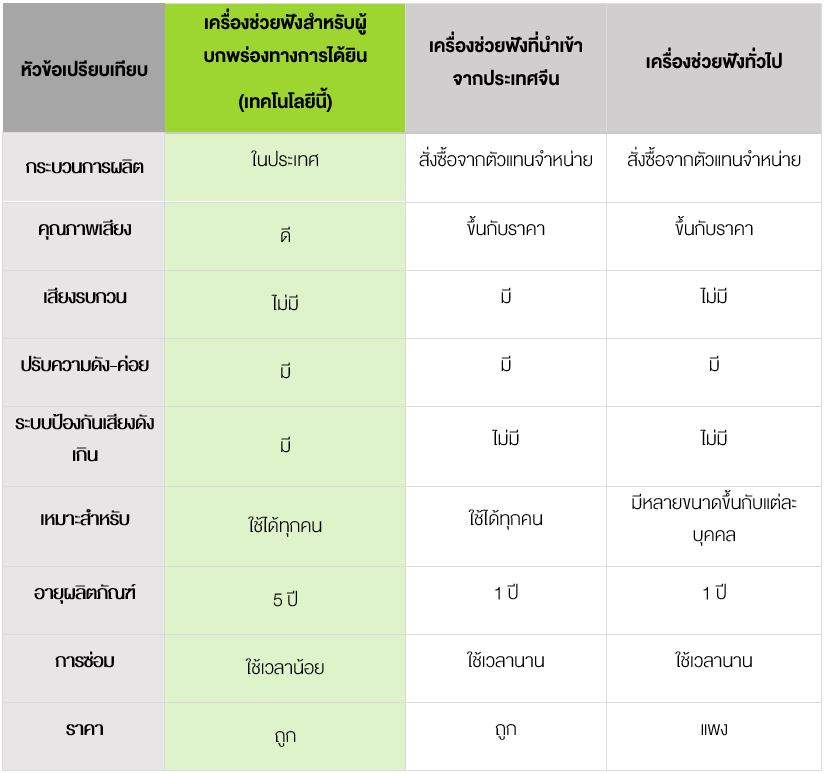 “เครื่องช่วยฟังสำหรับผู้บกพร่องทางการได้ยิน” ได้รับการพัฒนาคิดค้นขึ้นเพื่อทดแทนข้อด้อยของเครื่องช่วยฟังที่มีจำหน่ายในท้องตลาดทั่วไป อาศัยหลักการเปลี่ยนสัญญาณเสียงเป็นสัญญาณไฟฟ้า แล้วปรับปรุงและขยายสัญญาณให้เหมาะสม ส่งไปหูผู้ฟัง ซึ่งสามารถปรับระดับเสียงได้ตามต้องการ มีขนาดเล็กพกพาได้ ราคาถูก มีคุณภาพเสียงที่ดี เสียงดังชัดเจน ไม่มีเสียงก้องหรือเสียงรบกวนสามารถป้องกันเสียงที่ดังเกินได้ สามารถปรับระดับความเข้มเสียงได้ในช่วง 41-70 เดซิเบล และตอบสนองได้ตามช่วงที่สูญเสียการได้ยินตั้งแต่ 200-3800 เฮิรตซ์ นอกจากนี้ยังมีระบบป้องกันเสียงดังเกินกว่าระดับ 90 เดซิเบล