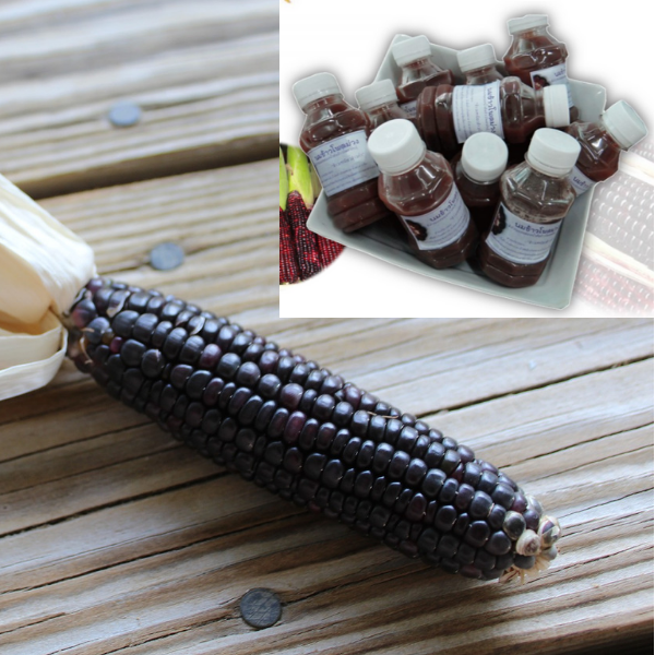 “นมข้าวโพดม่วง” ได้รับการพัฒนาคิดค้นสูตรเครื่องดื่มนมข้าวโพดม่วง ซึ่งเป็นผลิตภัณฑ์รูปแบบใหม่ ที่มีสารแอนโทไซยานินสูง มีคุณสมบัติช่วยต้านอนุมูลอิสระ ลดการอักเสบ ช่วยลดคอเลสเตอรอลและระดับน้ำตาลในเลือด อีกทั้งยังช่วยลดความเสี่ยงของโรคมะเร็งได้ มีสีจากธรรมชาติ ไม่เจือสีสังเคราะห์ และมีประโยชน์ต่อร่างกาย