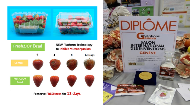 ผลิตภัณฑ์ “เม็ดบีดชีวภาพ (Fresh2JOY) สำหรับยืดอายุผักและผลไม้” มีลักษณะเป็นเม็ดบีดที่กักเก็บน้ำมันหอมระเหยที่มีฤทธิ์ในการยับยั้งการเจริญเติบโตของเชื้อจุลินทรีย์ ซึ่งเป็นสาเหตุหลักของการเน่าเสียของผักและผลไม้ ทำให้สามารถยืดอายุผักและผลไม้ให้คงคุณภาพได้ยาวนานยิ่งขึ้น ลดการเน่าเสียของผักและผลไม้ในระหว่างการขนส่ง อีกทั้งยังลดความเสียหายและเพิ่มโอกาสทางการตลาด เหมาะสำหรับทั้งเกษตรกรผู้ปลูก ผู้จัดจำหน่าย และผู้บริโภค