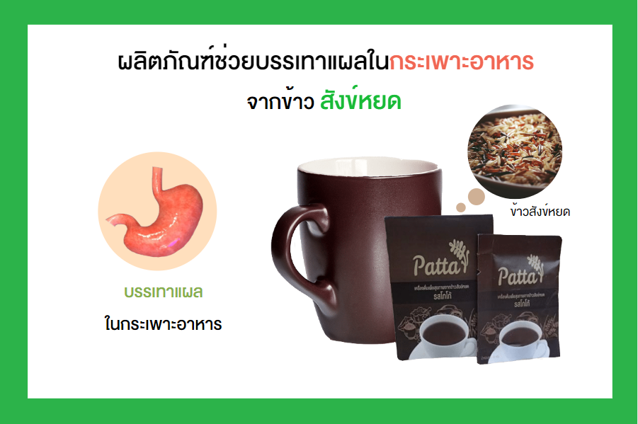 “ผลิตภัณฑ์ช่วยบรรเทาแผลในกระเพาะอาหารจากข้าวสังข์หยด” ได้รับการพัฒนาคิดค้นเพื่อบรรเทาและป้องกันการเกิดแผลในกระเพาะอาหารจากการหลั่งของกรดในกระเพาะอาหาร เหมาะสำหรับผู้ที่ต้องดูแลหรือควบคุมเวลาในการรับประทานอาหารให้ตรงเวลา เช่น กลุ่มผู้ป่วยโรคกระพาะอาหาร กลุ่มผู้สูงอายุ เป็นต้น ผลิตภัณฑ์ใช้ข้าวสังข์หยดเป็นวัตถุดิบหลักในการผลิต รับประทานง่ายโดยปรุงแต่งให้มีรสโกโก้หรือรสชาติอื่นๆ ตามต้องการ ผลการทดสอบต่อการเกิดแผลในกระเพาะที่เหนี่ยวนำให้เกิดแผลด้วยแอลกอฮอล์ พบว่ามีฤทธิ์บรรเทาและป้องกันการเกิดแผลในกระเพาะอาหารเนื่องจากแอลกอฮอล์ได้ อีกทั้งยังมีฤทธิ์ช่วยลดอาการแพ้โปรตีนในอาหาร ต้านอนุมูลอิสระและปรับภูมิคุ้มกันในร่างกายได้อีกด้วย