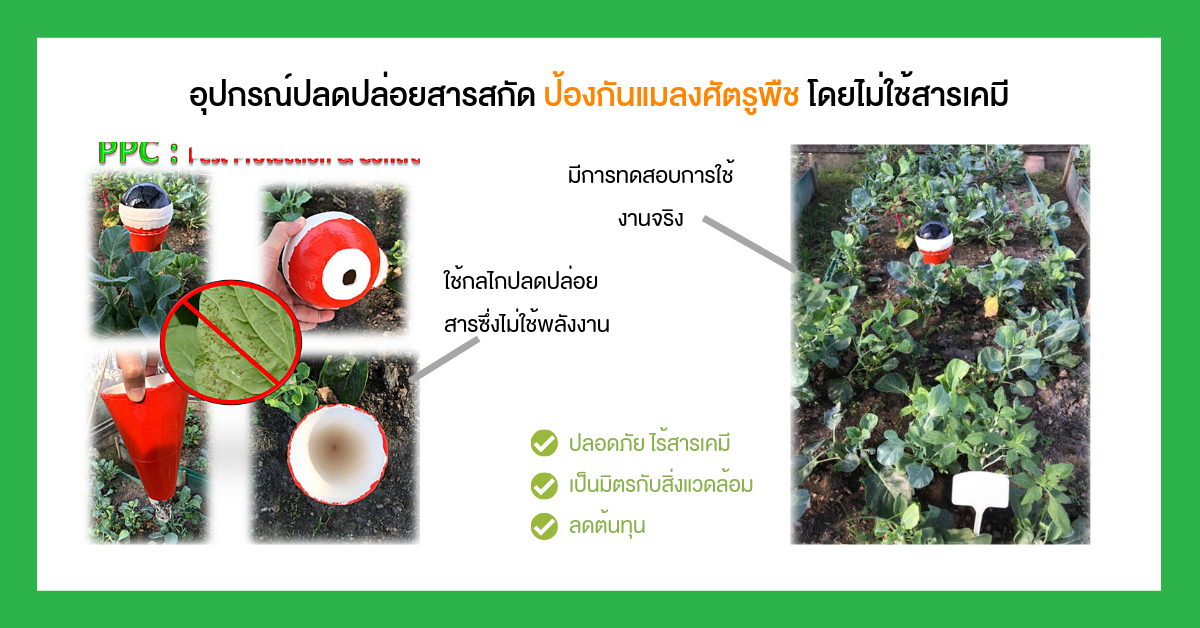 “อุปกรณ์ปลดปล่อยสารสกัดป้องกันแมลงศัตรูพืชโดยไม่ใช้สารเคมี” ได้รับการพัฒนาคิดค้นเพื่อป้องกันแมลงศัตรูพืช ประกอบด้วยอุปกรณ์บรรจุสารสกัดที่สามารถป้องกันแมลงศัตรูพืชจำพวกเพลี้ยด้วงหมัดผัก รวมทั้งหนอนใยผัก และหนอนกระทู้ผักทั้งในอากาศและใต้ดิน อุปกรณ์ไม่ใช้ไฟฟ้าหรือแบตเตอรี่ สามารถออกฤทธิ์ป้องกันแมลงศัตรูพืชได้ดีใกล้เคียงกับการใช้สารเคมี โดยมีระยะเวลาในการป้องกันแมลงศัตรูพืชประมาณ 60 วัน ต่อการบรรจุสารสกัด 1 ครั้ง