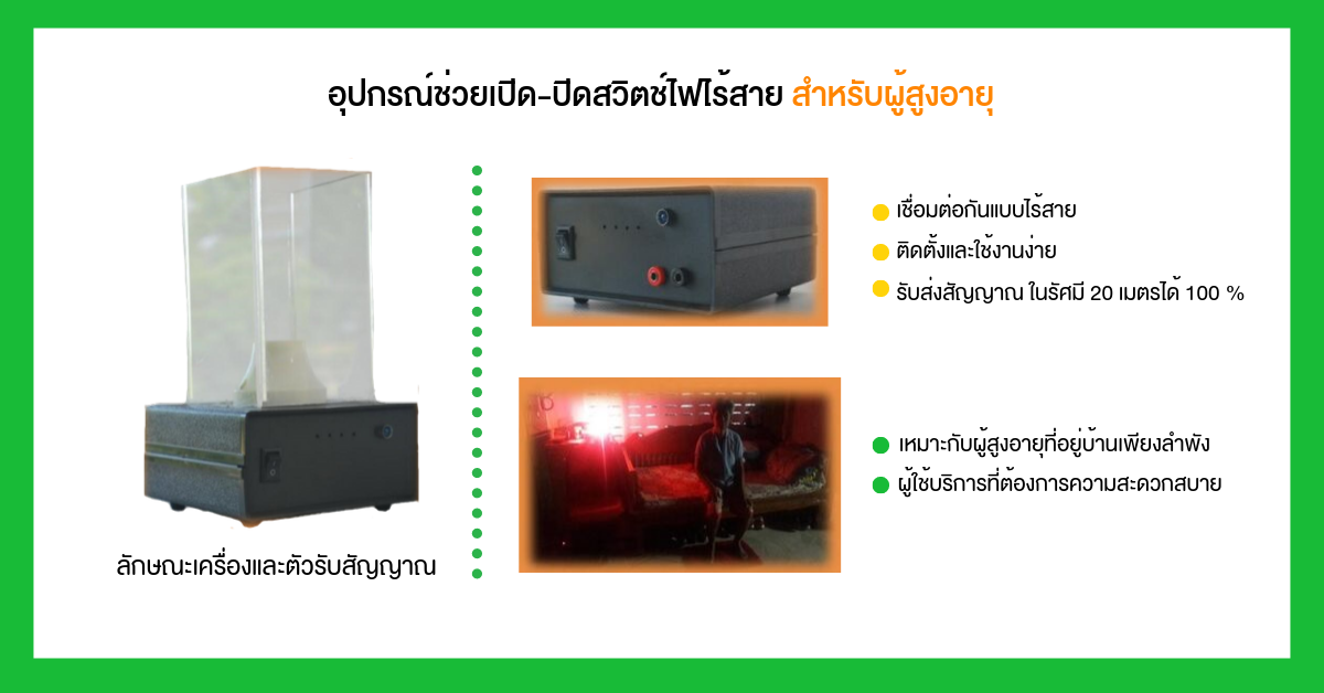 “อุปกรณ์ช่วยเปิด-ปิดสวิตช์ไฟไร้สายสำหรับผู้สูงอายุ” ได้รับการพัฒนาคิดค้นเพื่อให้ผู้สูงอายุสะดวกสบายยิ่งขึ้นในการเปิด-ปิดอุปกรณ์ที่ให้แสงสว่างภายในบ้าน โดยอุปกรณ์มีลักษณะเป็นแผ่นสามารถใช้เท้าเหยียบเพื่อควบคุมการเปิดปิดไฟฟ้าในระยะไกลได้อย่างสะดวกและง่ายดาย  ตัวอุปกรณ์มีความหนาเพียง 1 มิลลิเมตร ทำให้ผู้สูงอายุไม่สะดุดล้ม สามารถวางไว้ใต้พรมเช็ดเท้าบริเวณข้างเตียงผู้สูงอายุหรือบริเวณอื่นที่ต้องการ อุปกรณ์สามารถเชื่อมต่อกับอุปกรณ์ตัวรับแบบไร้สายได้หลายตัว การรับและส่งสัญญาณสามารถส่งผ่านผนังห้องและระหว่างชั้นในรัศมี 20 เมตรได้