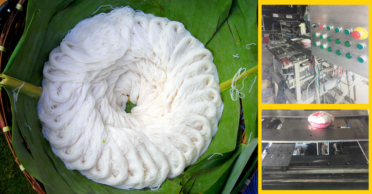 “เครื่องแพ็คฟิล์มห่ออาหารสำหรับโรงงานขนมจีน” ได้รับการพัฒนาคิดค้นเพื่อใช้ลดระยะเวลาและขั้นตอนการผลิตเส้นขนมจีนในโรงงานอุตสาหกรรม โดยสินค้าจะถูกแพ็คอัตโนมัติ ไม่ต้องใช้คนช่วย สินค้าที่ได้สะอาดถูกหลักอนามัย และได้มาตรฐานตามหลักกระทรวงสาธารณสุข ต้นทุนการผลิตต่ำ ทั้งยังได้ผลผลิตปริมาณมากกว่าการใช้แรงงานคน