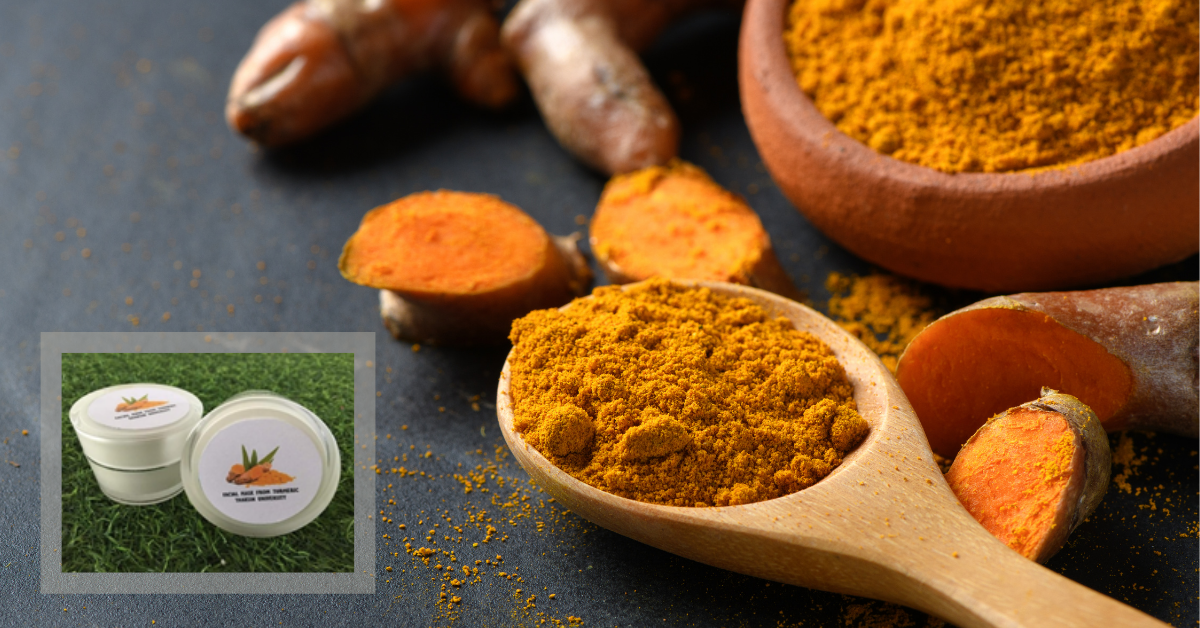 “ผลิตภัณฑ์พอกผิวหน้าจากสารสกัดขมิ้นชัน” ได้รับการพัฒนาคิดค้นในรูปแบบครีมพอกหน้าชนิดล้างออก จากสารสกัดขมิ้นชัน และสมุนไพรต่างๆ โดยพัฒนาสูตรตำรับด้วยการนำสมุนไพรที่สามารถยับยั้งการเจริญเติบโต และฆ่าเชื้อราที่เป็นสาเหตุทำให้เกิดโรคทางผิวหนัง มีอนุมูลอิสระกลุ่มฟิโนลิก ช่วยยับยั้งการเกิดฝ้า ชะลอความแก่ ช่วยลดความเหี่ยวย่นของผิวหนัง ต้านการเกิดปฏิกิริยาออกซิเดชันของสารอนุมูลอิสระ ช่วยเร่งการสร้างสารคอลลาเจน ช่วยเพิ่มการไหลเวียนของเส้นเลือดฝอย และการแลกเปลี่ยนออกซิเจนต่อเนื้อเยื่อ บำรุงผิวพรรณให้อ่อนนุ่ม และช่วยให้ผิวไม่แห้งกร้าน