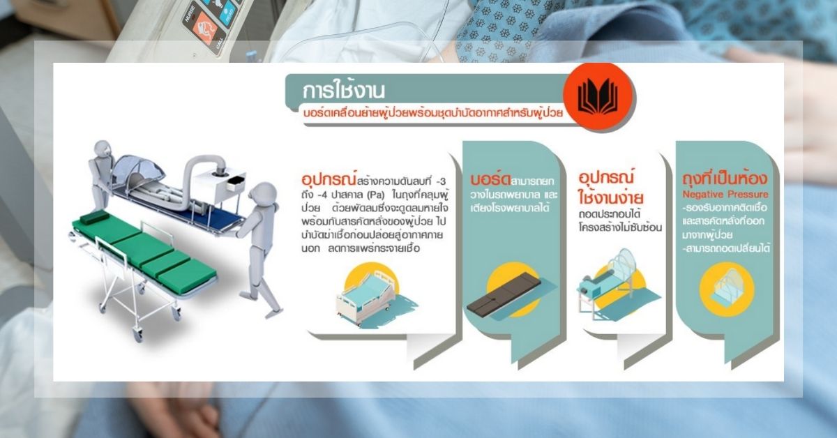 “บอร์ดเคลื่อนย้ายผู้ป่วยสำหรับผู้ป่วยโรคติดเชื้อทางเดินหายใจ” ได้รับการพัฒนาคิดค้นโดยเทคโนโลยีประกอบด้วย 3 ส่วน ได้แก่ ส่วนที่รองรับลมหายใจจากผู้ป่วย ส่วนที่นำพาอากาศที่ติดเชื้อเข้าสู่ชุดบำบัด และส่วนของการบำบัดอากาศ ทำให้เทคโนโลยีนี้สามารถใช้ป้องกันและควบคุมการแพร่เชื้อในขณะเคลื่อนย้ายผู้ป่วยโรคติดเชื้อทางเดินหายใจซึ่งสามารถแพร่เชื้อทางลมหายใจได้ นอกจากนี้ยังทำความสะอาดง่าย และใช้ได้ทั้งในโรงพยาบาล รถฉุกเฉิน และเตียงโรงพยาบาล