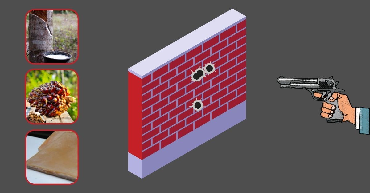 “ผนังอาคารกันกระสุนจากยางพาราและเส้นใยทะลายปาล์มเปล่า” ได้รับการพัฒนาคิดค้นโดยใช้ยางพาราและทะลายปาล์มเปล่าเป็นวัสดุผสม สามารถดูดซับแรงที่เกิดจากความเร็วของกระสุนปืน โดยไม่สามารถทะลุผ่านผนังไปได้ในระดับการป้องกัน 2A ตามเกณฑ์มาตรฐานการทดสอบของ NIJ สร้างมูลค่าเพิ่มให้กับวัสดุเหลือทิ้ง ลดปัญหาด้านสิ่งแวดล้อม อีกทั้งยังเป็นการนําวัสดุที่มีในท้องถิ่นมาประยุกต์ใช้ให้เกิดประโยชน์สูงสุด