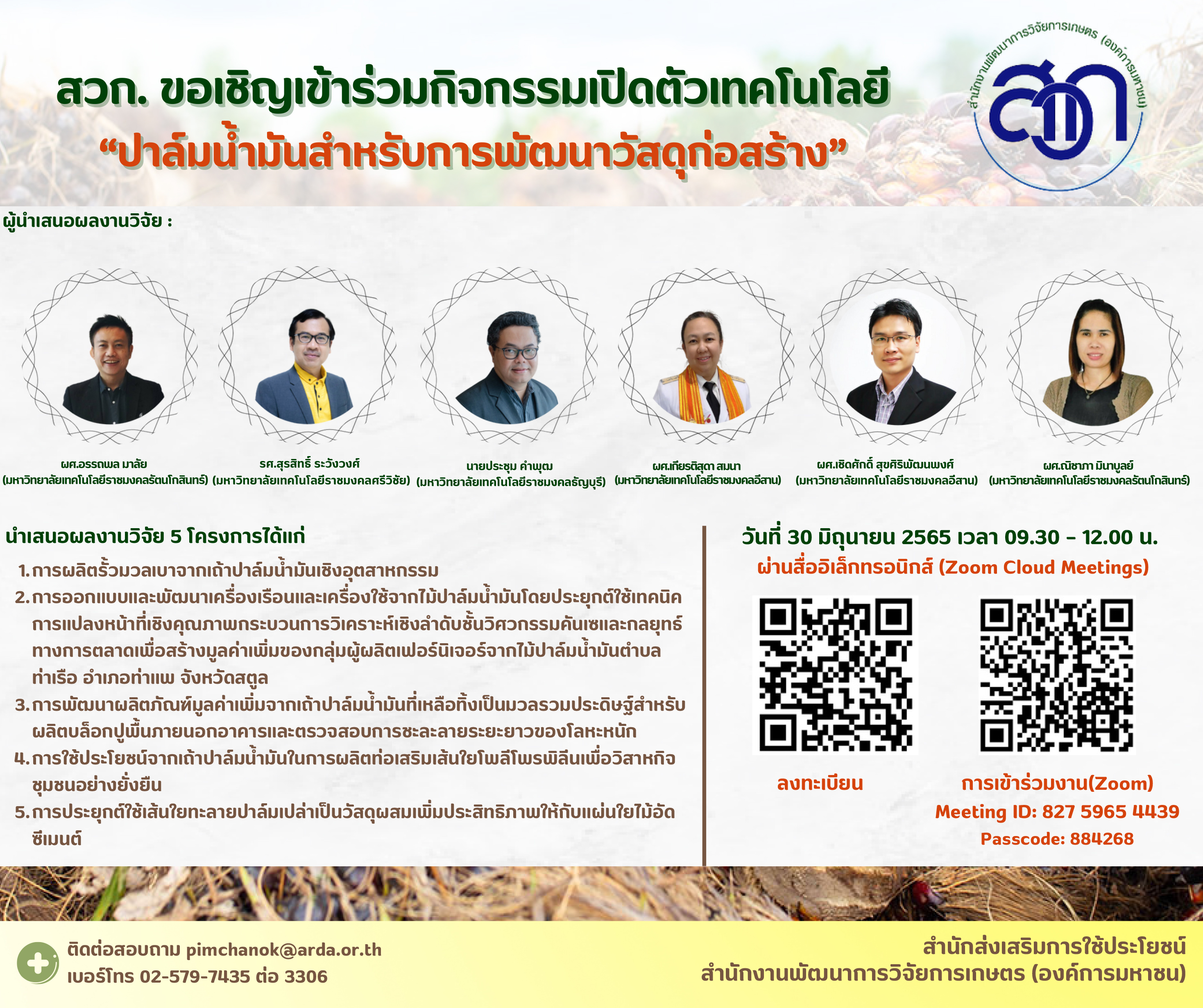 สวก. เชิญทุกท่านเข้าร่วมกิจกรรมเปิดตัวเทคโนโลยี "ปาล์มน้ำมันสำหรับการพัฒนาวัสดุก่อสร้าง" นำเสนอผลงานวิจัย 5 โครงการ ได้แก่
