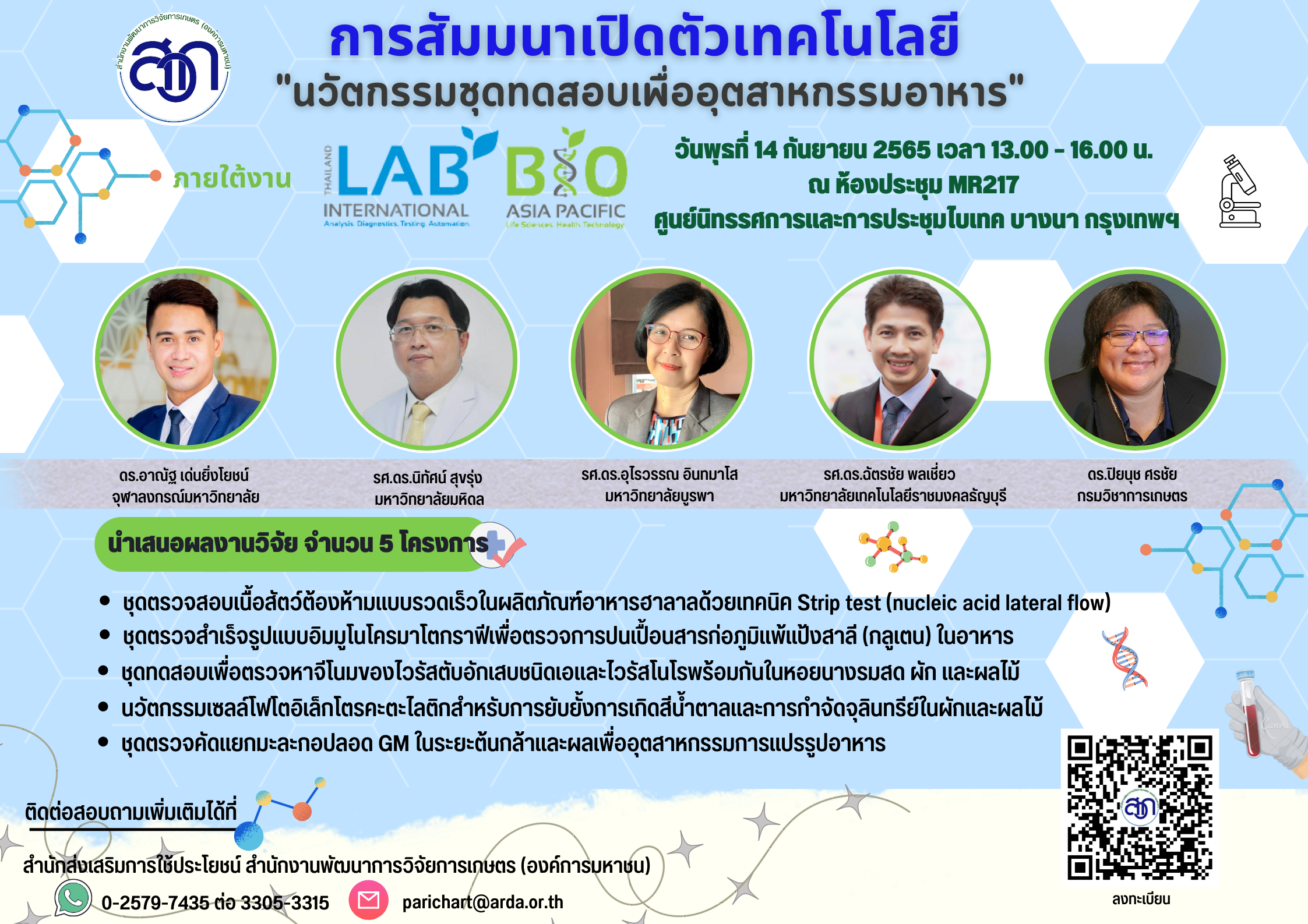 สำนักส่งเสริมการใช้ประโยชน์ สำนักงานพัฒนาการวิจัยการเกษตร (องค์การมหาชน) หรือ สวก. ขอเชิญเข้าร่วมสัมมนาเปิดตัวเทคโนโลยี "นวัตกรรมชุดทดสอบเพื่ออุตสาหกรรมอาหาร" ภายใต้งาน "Thailand LAB INTERNATIONAL 2022"