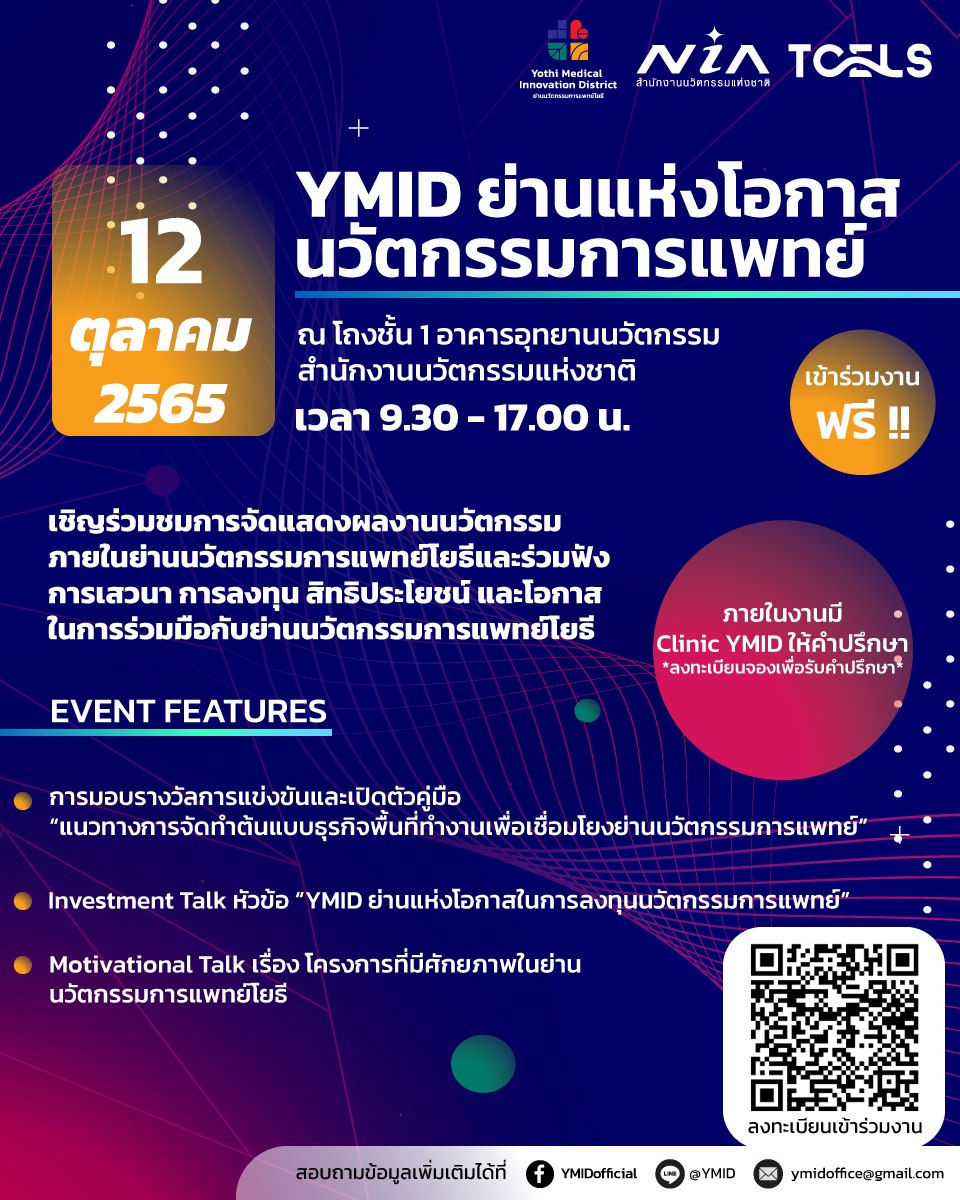 ขอเชิญชวนร่วมกิจกรรม YMID ย่านแห่งโอกาสนวัตกรรมการแพทย์ เพื่อสร้างโอกาสด้านนวัตกรรมการแพทย์ให้แก่ นักลงทุน นักวิจัย บุคลากรด้านการแพทย์ และประชาชนผู้สนใจ ร่วมชมการจัดแสดงผลงานนวัตกรรมภายในย่านนวัตกรรมการแพทย์โยธีและร่วมฟังการเสวนา การลงทุน สิทธิประโยชน์ และโอกาสในการร่วมมือกับย่านนวัตกรรมการแพทย์โยธี สามารถลงทะเบียนเข้าร่วมงานฟรี ไม่มีค่าใช้จ่าย