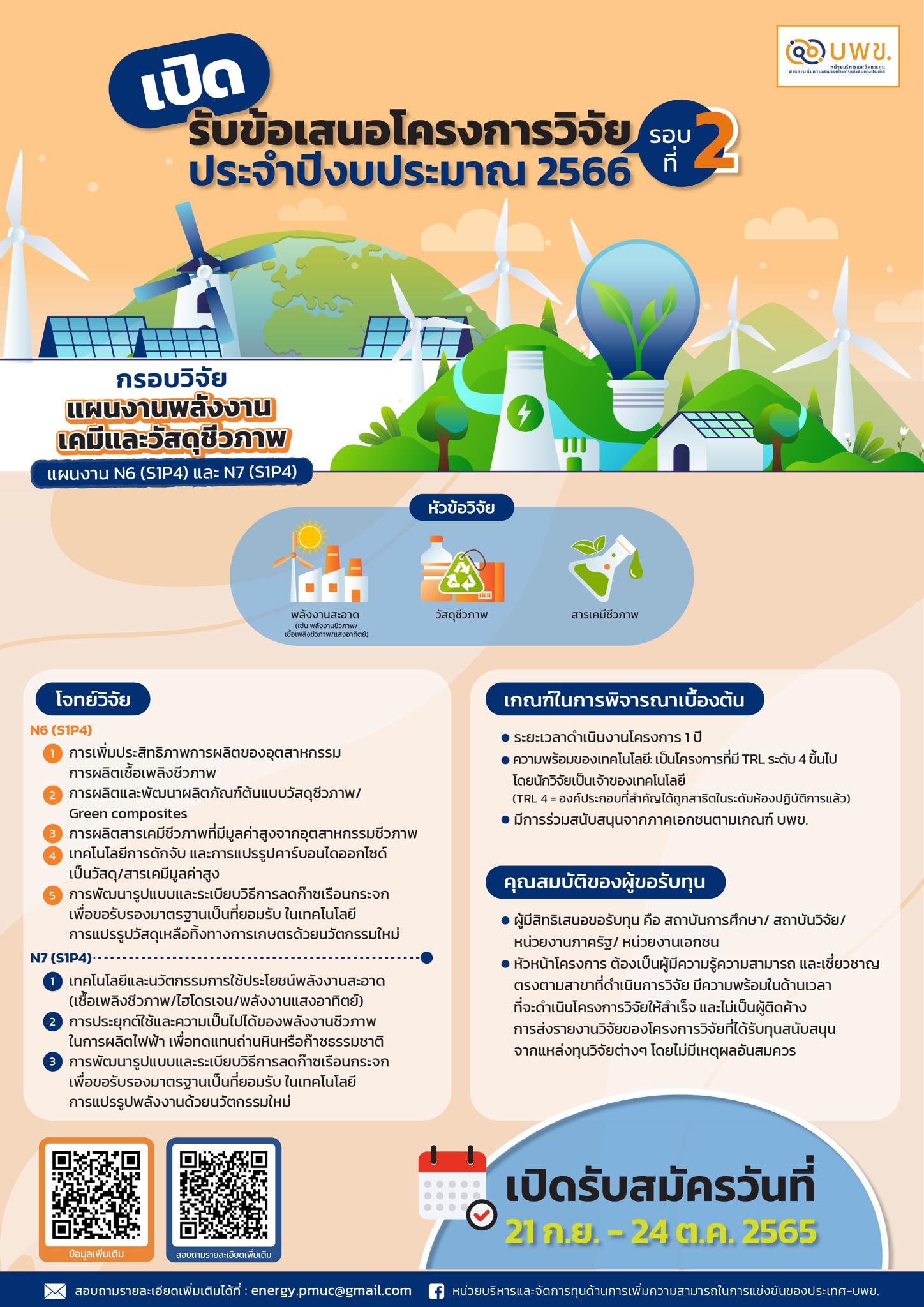 แผนงานพลังงาน เคมีและวัสดุชีวภาพ หน่วยบริหารและจัดการทุนด้านการเพิ่มความสามารถในการแข่งขันของประเทศ (บพข.) ประกาศรับข้อเสนอโครงการวิจัยฉบับสมบูรณ์ (Full proposal) ประจำปีงบประมาณ 2566 (รอบที่ 2) แผนงาน N6 (S1P4) และ N7 (S1P4) เพื่อสนับสนุนการวิจัยและนวัตกรรมเพื่อเพิ่มขีดความสามารถในการแข่งขันตามเป้าหมายของนโยบายและ ยุทธศาสตร์การอุดมศึกษา วิทยาศาสตร์ วิจัย และนวัตกรรม พ.ศ. 2566-2570 ยุทธศาสตร์ที่ 1 การพัฒนาเศรษฐกิจไทยด้วยเศรษฐกิจสร้างคุณค่าและเศรษฐกิจสร้างสรรค์ ให้มีความสามารถในการแข่งขัน และพึ่งพาตนเองได้อย่างยั่งยืน พร้อมสู่อนาคต โดยใช้วิทยาศาสตร์ การวิจัยและนวัตกรรม