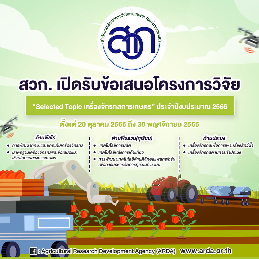 สํานักงานพัฒนาการวิจัยการเกษตร (องค์การมหาชน) หรือ สวก. ได้ประกาศรับข้อเสนอโครงการวิจัยประจำปีงบประมาณ 2566 โดยเน้นการสนับสนุนทุนวิจัยที่จะก่อให้เกิดประโยชน์เพิ่มความสามารถในการแข่งขันของประเทศ เป็นไปตามเป้าหมายและตัวชี้วัด (OKR) ระดับประเทศตามนโยบายและยุทธศาสตร์การอุดมศึกษา วิทยาศาสตร์ วิจัยและนวัตกรรม (อววน.) ใน ยุทธศาสตร์ที่ 2 (S2) การยกระดับสังคมและสิ่งแวดล้อมให้มีการพัฒนาอย่างยั่งยืนสามารถแก้ไขปัญหาท้าทายและปรับตัวได้ทันต่อพลวัตการเปลี่ยนแปลงของโลก โดยใช้วิทยาศาสตร์การวิจัยและนวัตกรรม แผนงาน P11 (S2) พัฒนาเศรษฐกิจฐานราก ขจัดความยากจนและลดความเหลื่อมล้ำ แผนงานย่อย N17 (S2P11) ยกระดับการเกษตรแบบ Smart farming ในชุมชนโดยใช้เทคโนโลยีและนวัตกรรม สวก. จึงได้กำหนดประเด็นวิจัยที่มีความเฉพาะเจาะจงกับความต้องการของผู้ใช้ประโยชน์ของเครื่องจักรกลการเกษตร สอดคล้องกับสถานการณ์ปัจจุบัน แบบ Selected Topic ใน 3 กลุ่ม ได้แก่ พืชไร่ พืชสวน (ทุเรียน) และประมง