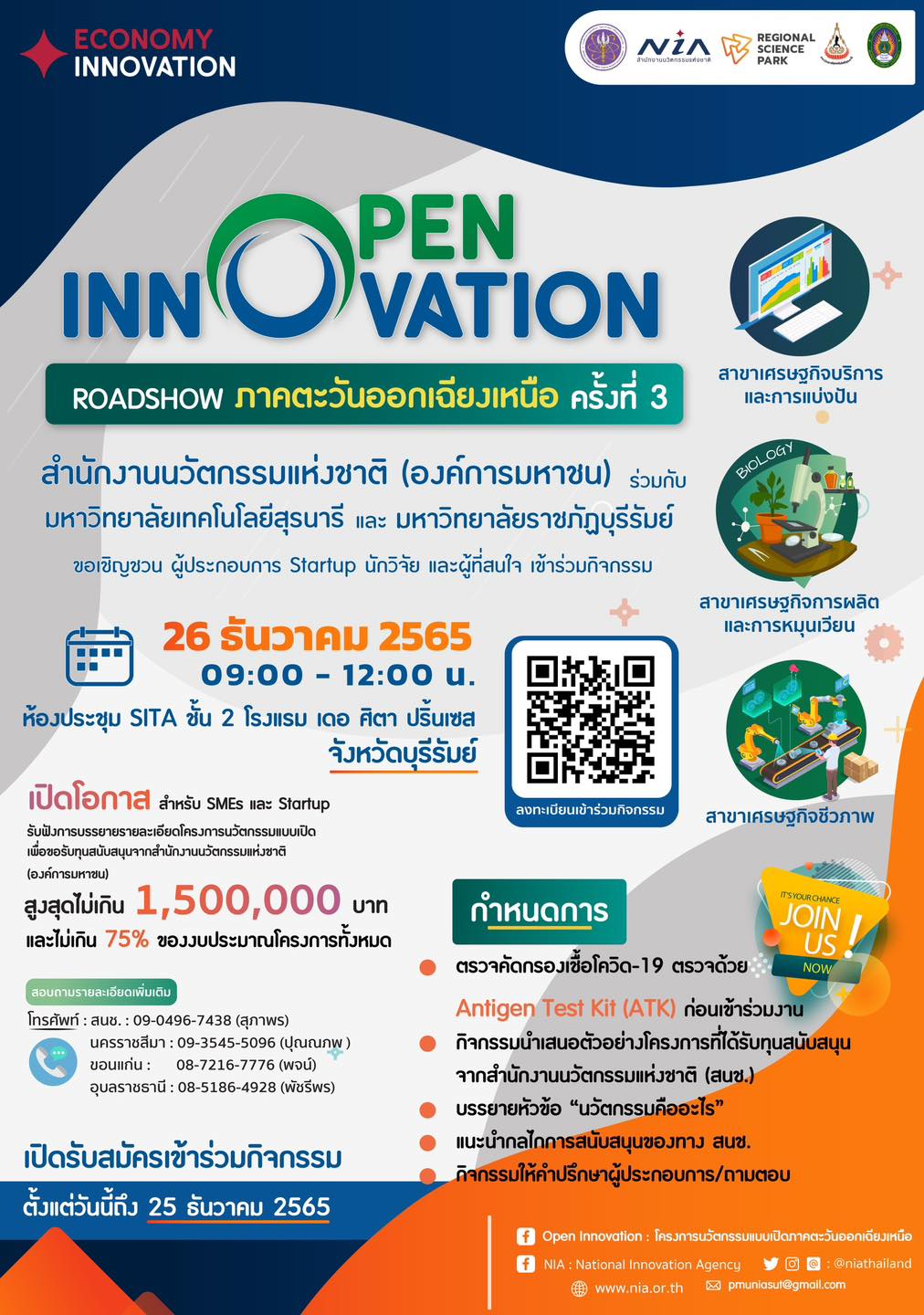 สำนักงานนวัตกรรมแห่งชาติ (องค์การมหาชน) หรือ NIA ร่วมกับ เครือข่ายนวัตกรรมแบบเปิด อุทยานวิทยาศาสตร์ภาคตะวันออกเฉียงเหนือ (จ.นครราชสีมา) ขอเชิญชวน นักวิจัย ผู้ประกอบการ Startup และผู้ที่สนใจ เข้าร่วมกิจกรรม "Open Innovation Road Show ภาคตะวันออกเฉียงเหนือ ครั้งที่ 3 ประจำปีงบประมาณ 2566 " เปิดโอกาสสำหรับผู้สนใจ เข้ารับฟังบรรยายการยื่นข้อเสนอโครงการเพื่อขอทุนสนับสนุนจากสำนักงานนวัตกรรมแห่งชาติ (องค์การมหาชน)