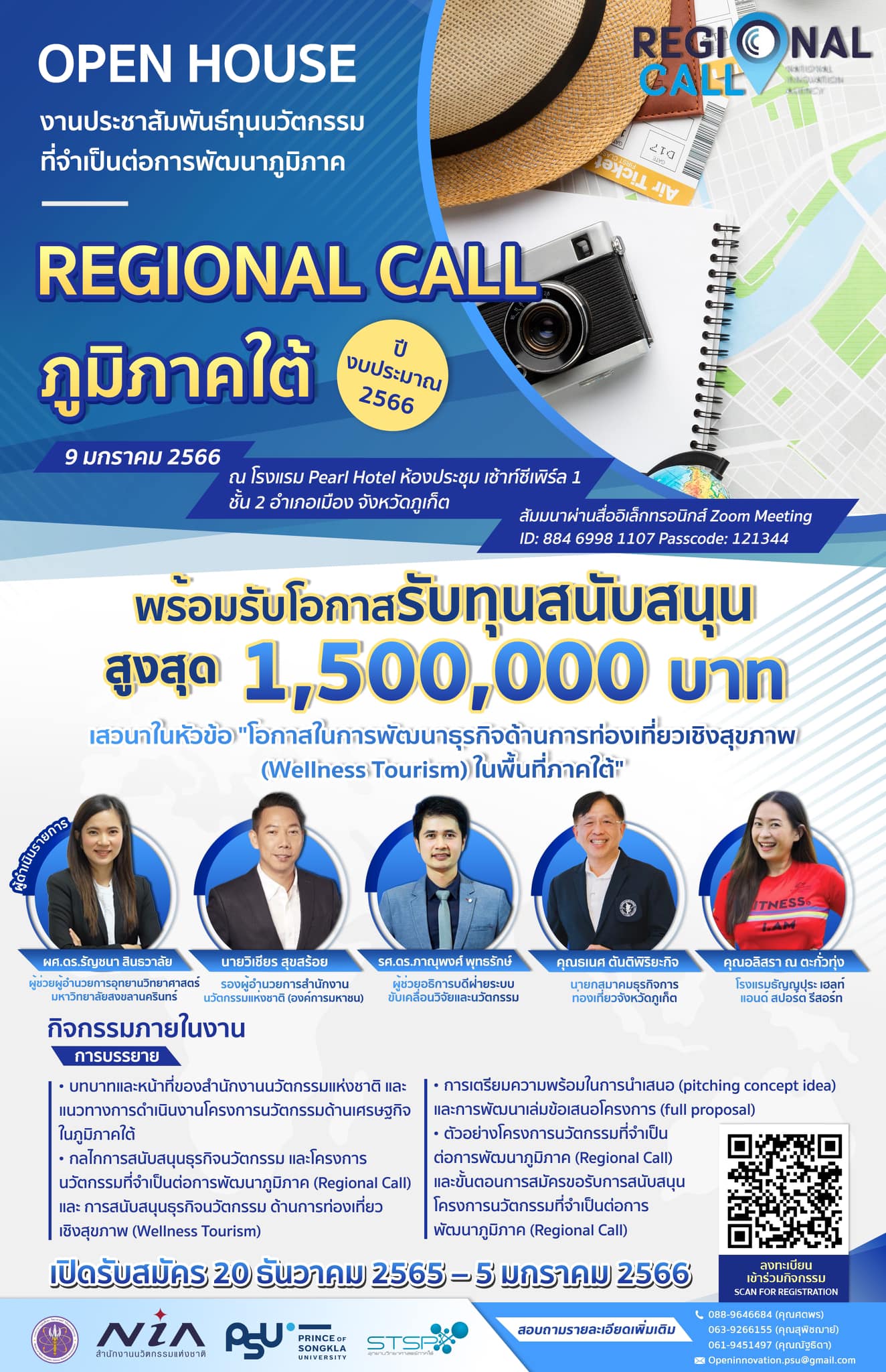 สำนักงานนวัตกรรมแห่งชาติ (องค์การมหาชน) หรือ NIA ร่วมกับ อุทยานวิทยาศาสตร์ ม.อ. ขอเชิญชวน ผู้ประกอบการ และผู้ที่สนใจ เข้าร่วมกิจกรรม Open House เพื่อรับฟังแนวทางการสนับสนุนเงินทุนให้เปล่าสูงสุดไม่เกินโครงการละ 1,500,000 บาท ในหัวข้อ “การท่องเที่ยวเชิงสุขภาพ (Wellness Tourism)” 3 สาขาย่อย ดังนี้ ธุรกิจด้านดูแลสุขภาพ/ความงาม เพื่อการท่องเที่ยว, ธุรกิจด้านการท่องเที่ยว/ฮาลาล เพื่อการท่องเที่ยวและด้านผลิตภัณฑ์/ฮาลาล (อาหาร สปา และผลิตภัณฑ์เสริมความงาม)