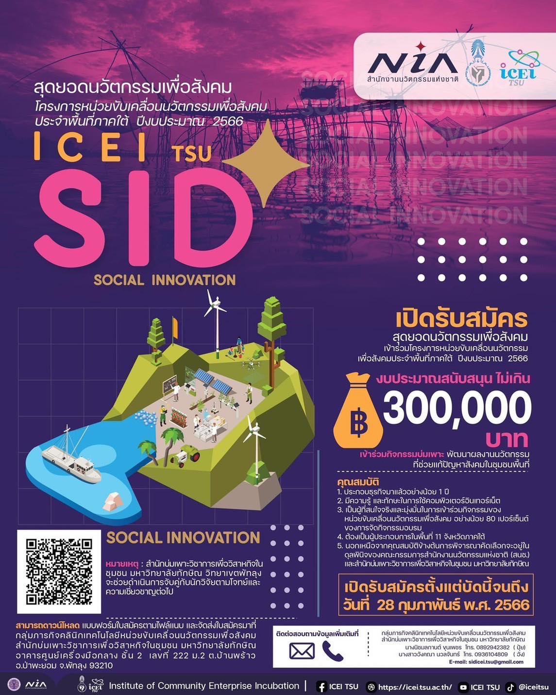 สำนักงานนวัตกรรมแห่งชาติ (องค์การมหาชน) หรือ NIA เปิดรับสมัครสุดยอดนวัตกรรมเพื่อสังคมและเข้าร่วม "โครงการหน่วยขับเคลื่อนนวัตกรรมเพื่อสังคมประจำพื้นที่ภาคใต้ ปีงบประมาณ 2566" สำหรับผู้ประกอบการที่ต้องการพัฒนาผลงานนวัตกรรมที่ช่วยแก้ปัญหาสังคมในชุมชนพื้นที่ โดยจะมีการคัดเลือกผลงานนวัตกรรมอย่างน้อย 15 ผลงาน เพื่อรับทุนสนับสนุนในการพัฒนาผลงานต่อไป