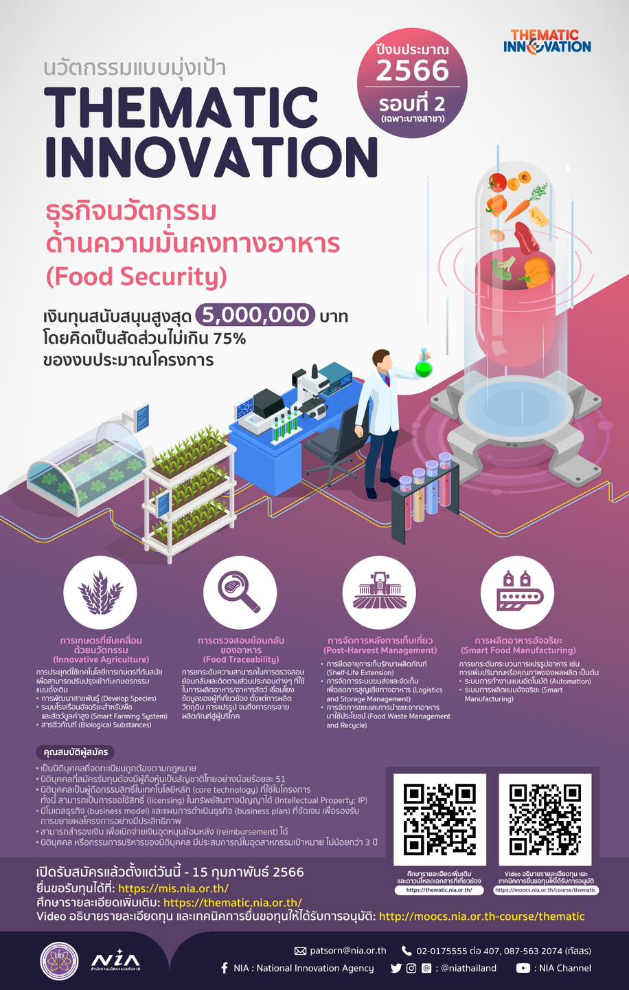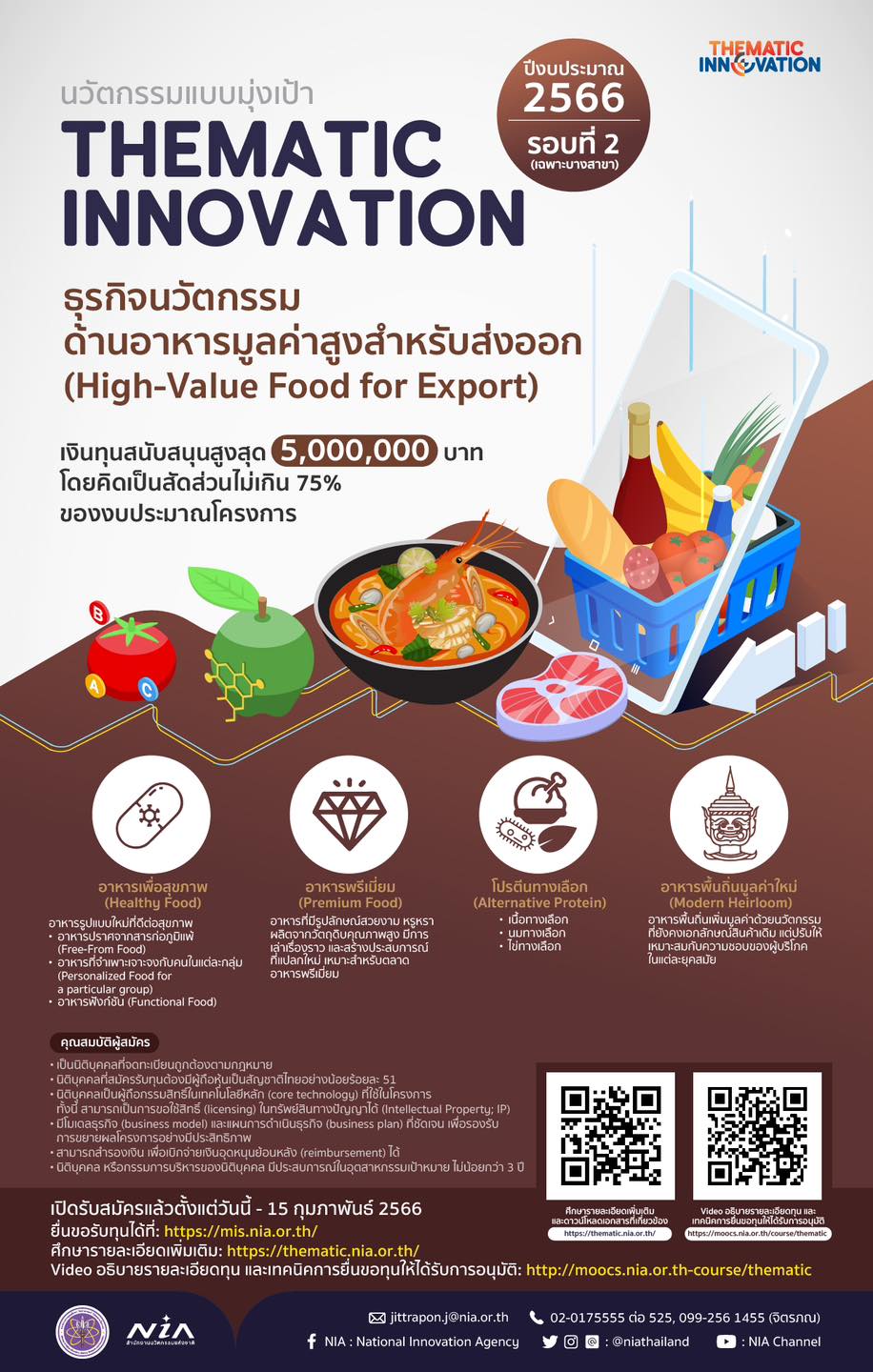 สำนักงานนวัตกรรมแห่งชาติ (องค์การมหาชน) โดยฝ่ายนวัตกรรมเพื่อเศรษฐกิจ เปิดรับข้อเสนอโครงการเพื่อรับทุนอุดหนุนโครงการนวัตกรรมแบบมุ่งเป้า (Thematic Innovation Grant) ประจำปีงบประมาณ 2566 (รอบที่ 2) เฉพาะสาขา อาหารมูลค่าสูงสำหรับส่งออก และความมั่นคงทางอาหาร โดยเป็นทุนให้เปล่า (grant) แบบอุดหนุนบางส่วน (matching fund) มูลค่าไม่เกิน 5,000,000 บาท สำหรับผู้ประกอบการที่ต้องการพัฒนาต้นแบบนวัตกรรม (prototype) และทดสอบประสิทธิภาพการใช้งาน (efficiency) ในสภาพแวดล้อมจริง (หรือใกล้เคียง) โดยต้นแบบดังกล่าวต้องมีความเป็นนวัตกรรมระดับประเทศขึ้นไป ในด้านผลิตภัณฑ์ (product) บริการ (service) หรือกระบวนการ (process) และสามารถสร้างผลกระทบเชิงเศรษฐกิจในสาขาอุตสาหกรรมเป้าหมายที่กำหนด (theme) ได้