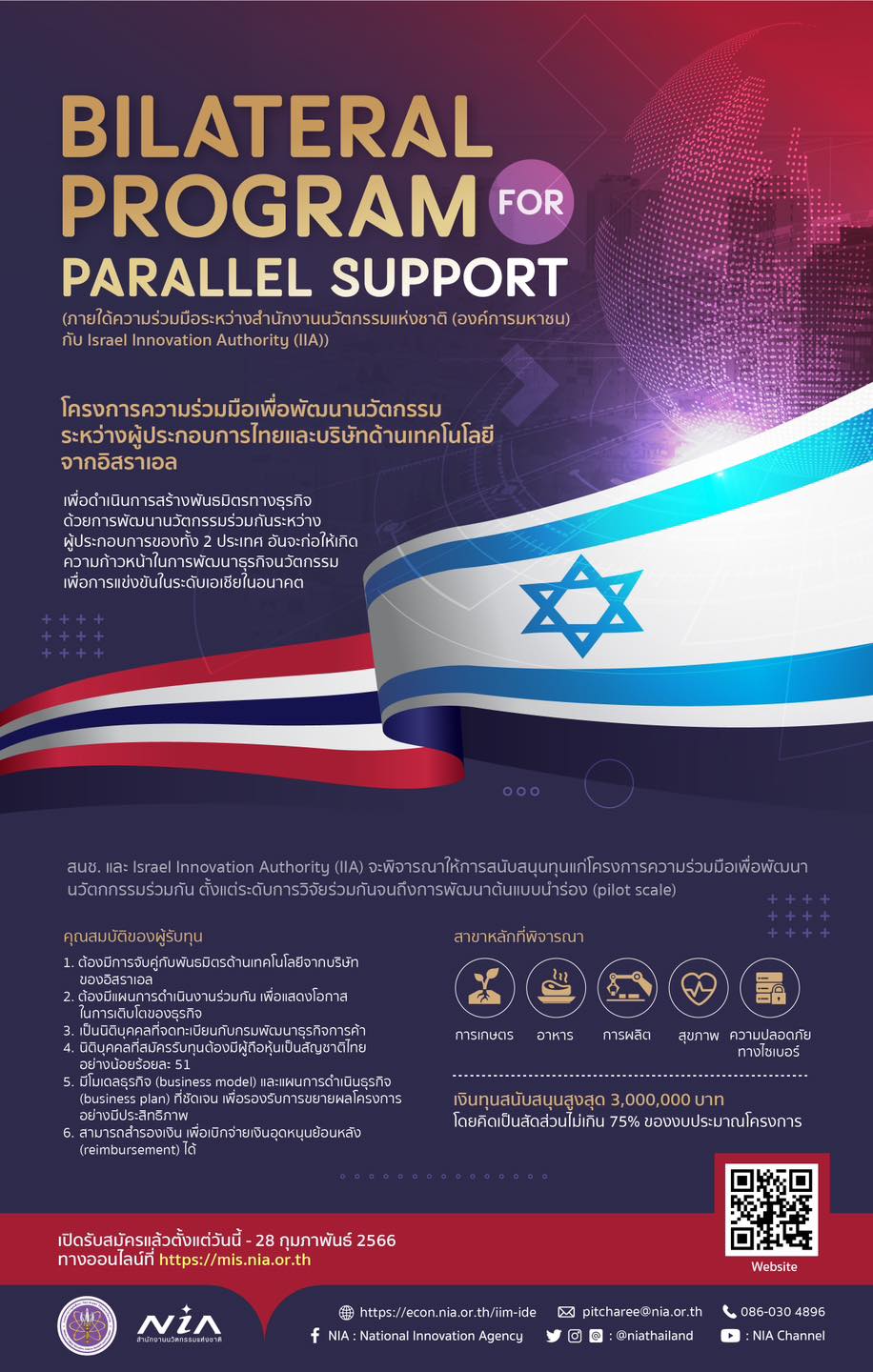 สำนักงานนวัตกรรมแห่งชาติ (องค์การมหาชน) หรือ NIA และ Israel Innovation Authority (IIA) เปิดโครงการ Bilateral Program for Parallel Support เพื่อเปิดโอกาสให้แก่ผู้ประกอบการไทยที่มีความร่วมมือกับบริษัทด้านเทคโนโลยีจากอิสราเอล ทั้งด้านความร่วมมือในการวิจัยและพัฒนา (R&D) หรือความร่วมมือในการดำเนินโครงการนำร่อง (Pilot scale) เพื่อลดความเสี่ยงในการต่อยอดนวัตกรรมจากอิสราเอล โดยโครงการความร่วมมือเพื่อพัฒนานวัตกรรมระหว่างผู้ประกอบการไทยและบริษัทด้านเทคโนโลยีจากอิสราเอล ดำเนินการสร้างพันธมิตรทางธุรกิจด้วยการพัฒนานวัตกรรมร่วมกันระหว่างผู้ประกอบการของทั้ง 2 ประเทศ อันจะก่อให้เกิดความก้าวหน้าในการพัฒนาธุรกิจนวัตกรรมเพื่อการแข่งขันในระดับเอเชียในอนาคต