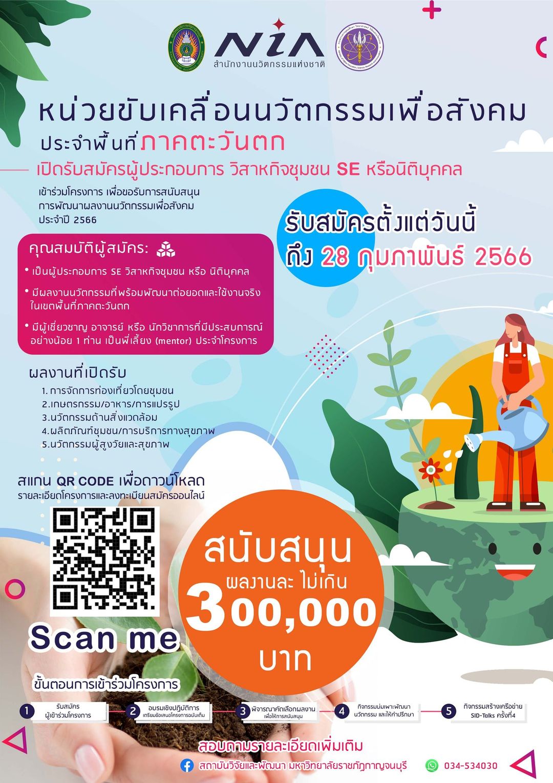 สำนักงานนวัตกรรมแห่งชาติ (องค์การมหาชน) หรือ NIA เปิดรับสมัครผู้ประกอบการ วิสาหกิจชุมชน SE หรือนิติบุคคล ที่ต้องการพัฒนาผลงานนวัตกรรมที่สามารถแก้ไขปัญหาหรือพัฒนากิจการของตนเองให้ดีขึ้น และสนใจเข้าร่วมโครงการหน่วยขับเคลื่อนนวัตกรรมเพื่อสังคม ประจำพื้นที่ภาคตะวันตก (SID-KRU) เพื่อขอรับการสนับสนุนการพัฒนาผลงานนวัตกรรมเพื่อสังคม ปีงบประมาณ 2566 มูลค่าสูงสุด 300,000 บาทต่อโครงการ