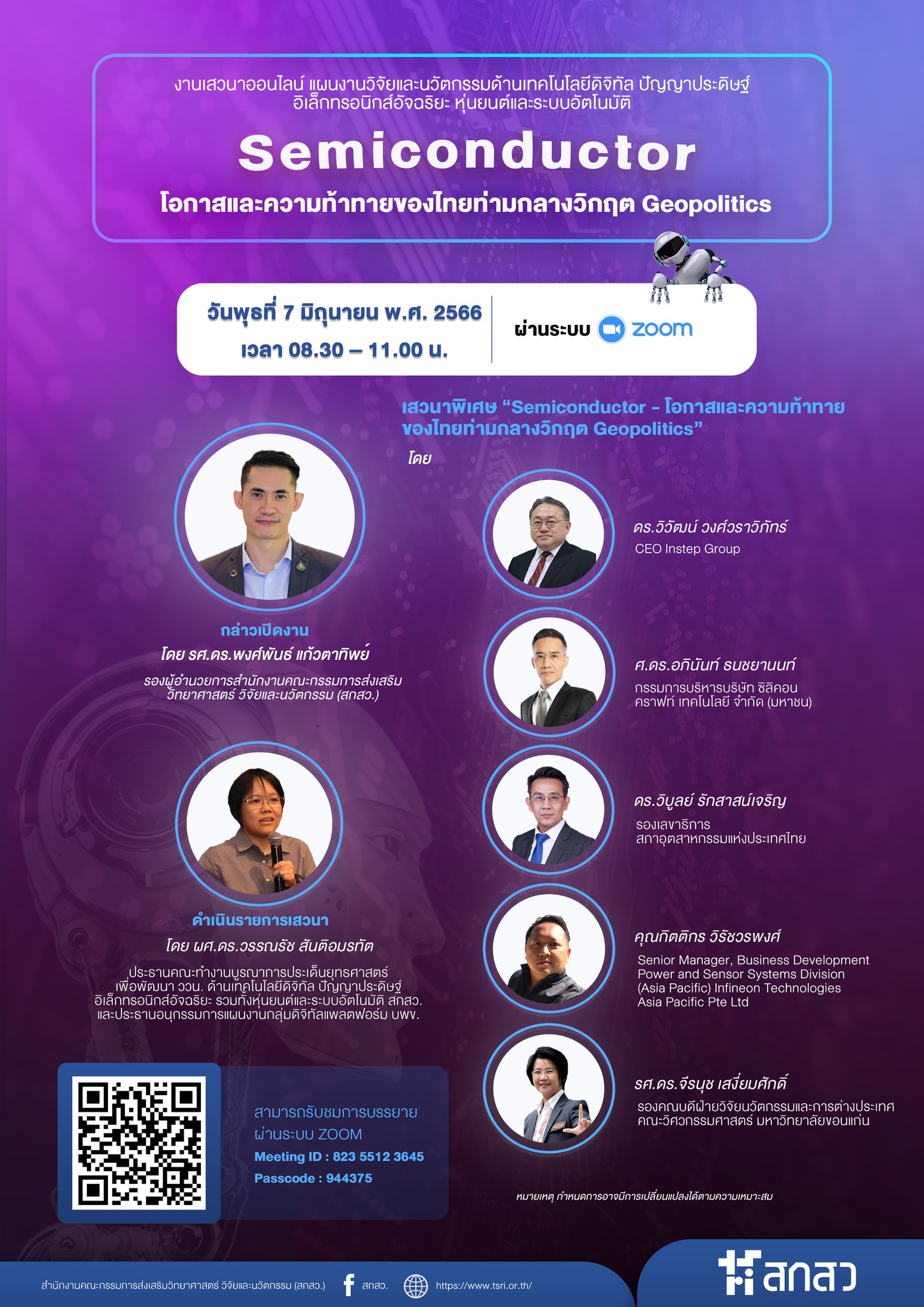 สกสว.ขอเชิญชวนร่วมเสวนาออนไลน์ แผนงานวิจัยและนวัตกรรมด้านเทคโนโลยีดิจิทัล ปัญญาประดิษฐ์ อิเล็กทรอนิกส์อัจฉริยะ หุ่นยนต์และระบบอัตโนมัติ “Semiconductor - โอกาสและความท้าทายของไทยท่ามกลางวิกฤต Geopolitics”