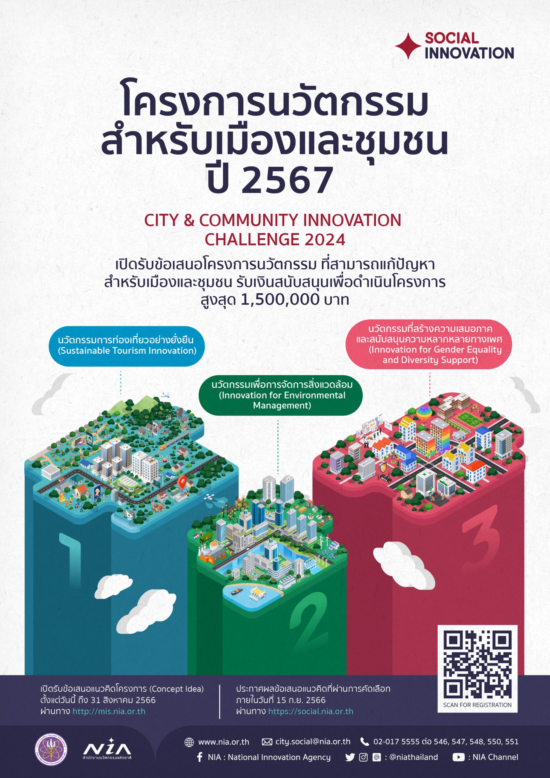 สำนักงานนวัตกรรมแห่งชาติ (องค์การมหาชน) (สนช.) เปิดรับข้อเสนอโครงการนวัตกรรมสำหรับเมืองและชุมชน ประจำปี 2567 (City & Community Innovation Challenge 2024) ที่สามารถแก้ปัญหาสำหรับเมืองและชุมชน ซึ่งองค์กรที่ได้รับคัดเลือกจะได้รับเงินสนับสนุนเพื่อนำไปดำเนินการจริงในพื้นที่ ตามหลักเกณฑ์ที่ สนช. กำหนด ภายในระยะเวลา 12 เดือนของการดำเนินงาน ซึ่งเมื่อดำเนินโครงการนำร่องแล้วเสร็จ สามารถขยายผลแนวคิด เทคโนโลยี โอกาสทางสังคม และธุรกิจ ไปยังพื้นที่อื่นๆ ต่อไป