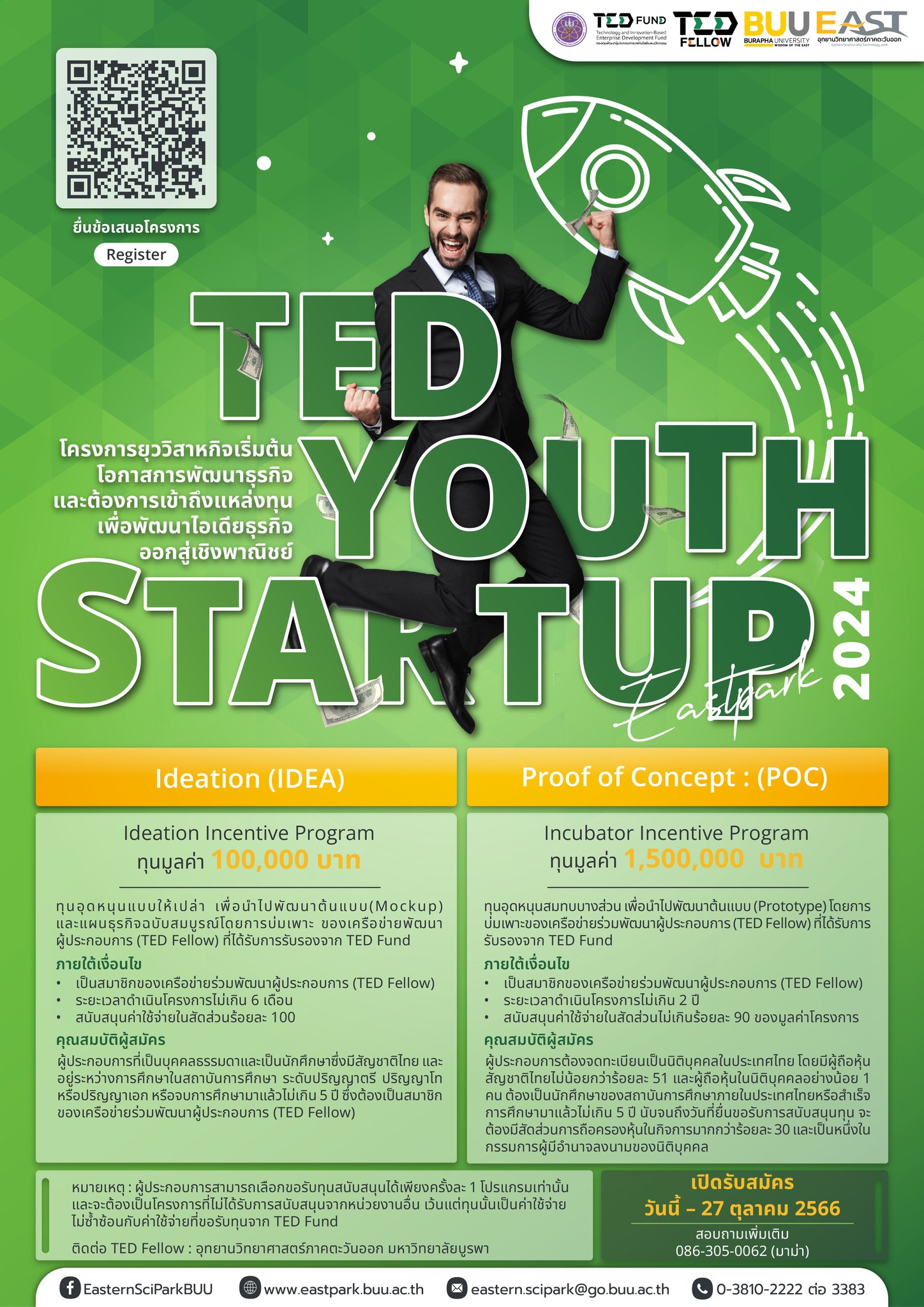 อุทยานวิทยาศาสตร์ภาคตะวันออก (EaST Park) ร่วมกับ TED Fellow หน่วยงานพันธมิตรของกองทุนพัฒนาผู้ประกอบการเทคโนโลยีและนวัตกรรม (TED Fund) ขอเชิญชวนผู้ประกอบการ และ นักศึกษา ที่มีความสนใจในการพัฒนาธุรกิจและต้องการเข้าถึงแหล่งทุนเพื่อพัฒนาไอเดียธุรกิจออกสู่เชิงพาณิชย์ สมัครเข้าร่วม "โครงการยุววิสาหกิจเริ่มต้น (TED Youth Startup 2024)" แบ่งเป็น 2 ทุน