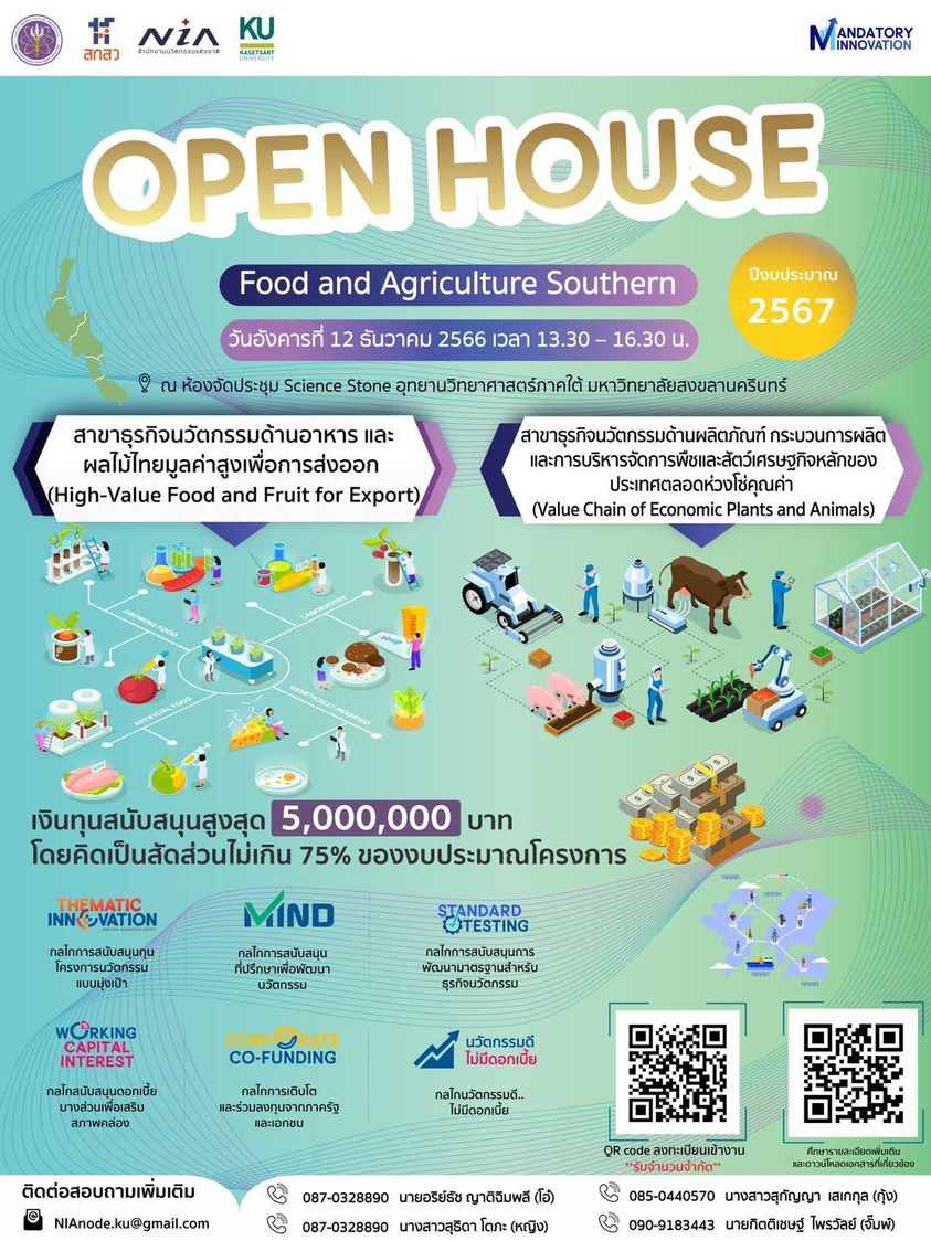 สำนักงานนวัตกรรมแห่งชาติ (องค์การมหาชน) (NIA) ร่วมกับมหาวิทยาลัยเกษตรศาสตร์ (KU) เชิญเข้าร่วมกิจกรรม Mandatory Innovation Open House สาขาธุรกิจนวัตกรรมอาหารและเกษตร ภูมิภาคใต้ ประจำปีงบประมาณ 2567 เพื่อแนะนำกลไกการสนับสนุนธุรกิจนวัตกรรมด้านอาหารและผลไม้ไทยมูลค่าสูงเพื่อการส่งออกและด้านพืชและสัตว์เศรษฐกิจในภูมิภาคใต้ วงเงินสนับสนุนโครงการสูงสุด 5,000,000 บาท โดยเปิดโอกาสสำหรับโครงการที่มีศักยภาพ และมีความพร้อมในการพัฒนานวัตกรรมออกสู่ตลาด เพื่อให้สามารถถึงเป้าหมายได้อย่างรวดเร็ว