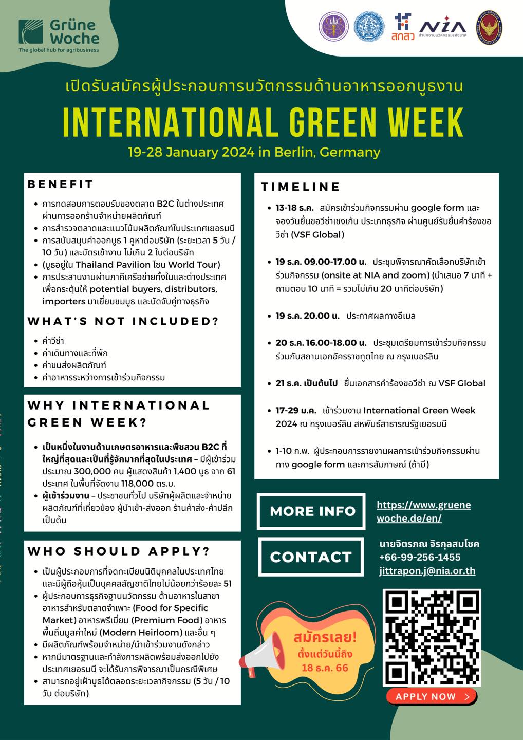 สำนักงานนวัตกรรมแห่งชาติ (NIA) ร่วมกับสถานเอกอัครราชทูตไทย ณ กรุงเบอร์ลิน รับสมัครผู้ประกอบการนวัตกรรมด้านอาหาร ร่วมออกบูธในงาน International Green Week 2024 เป็นหนึ่งในงานด้านเกษตรกรอาหารและพืชสวน B2C ที่ใหญ่ที่สุดและเป็นที่รู้จักมากที่สุดในประเทศ มีผู้เข้าร่วมประมาณ 300,000 คน ผู้แสดงสินค้า 1,400 บูธ จาก 61 ประเทศ