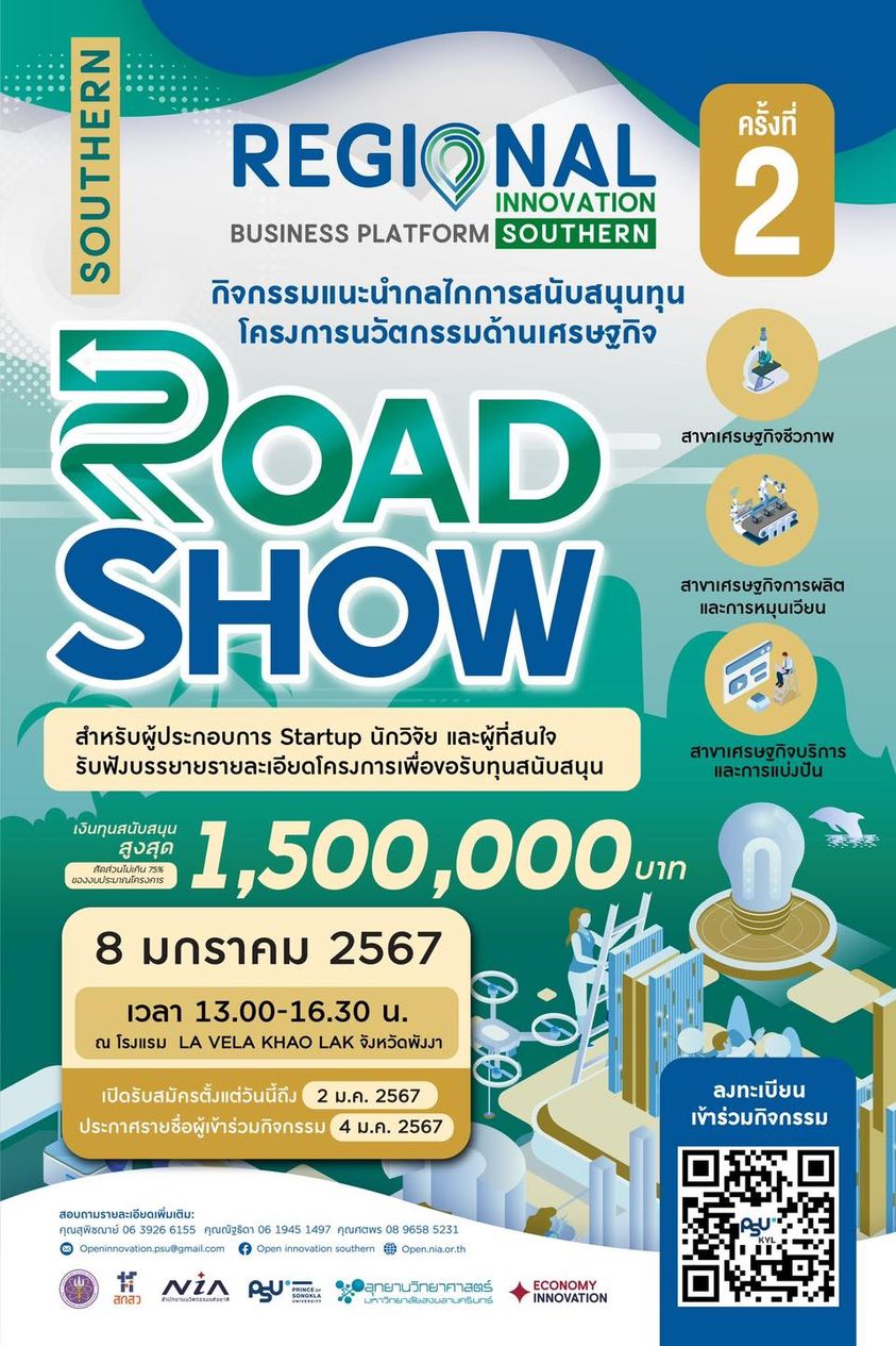สำนักงานนวัตกรรมแห่งชาติ (NIA) ร่วมกับอุทยานวิทยาศาสตร์ มหาวิทยาลัยสงขลานครินทร์ เชิญเข้าร่วมกิจกรรม Regional Innovation Roadshow ภาคใต้ ครั้งที่ 2 เปิดโอกาสสำหรับผู้ประกอบการ SME START UP อาจารย์และนักวิจัยที่สนใจ เข้ารับฟังการขอรับทุนสนับสนุน Regional Innovation Business Platform และแนะนำกลไกการสนับสนุนทุนโครงการนวัตกรรมด้านเศรษฐกิจสำหรับผู้ที่สนใจสมัครรับเงินทุนสนับสนุนสูงสุด 1.5 ล้านบาท