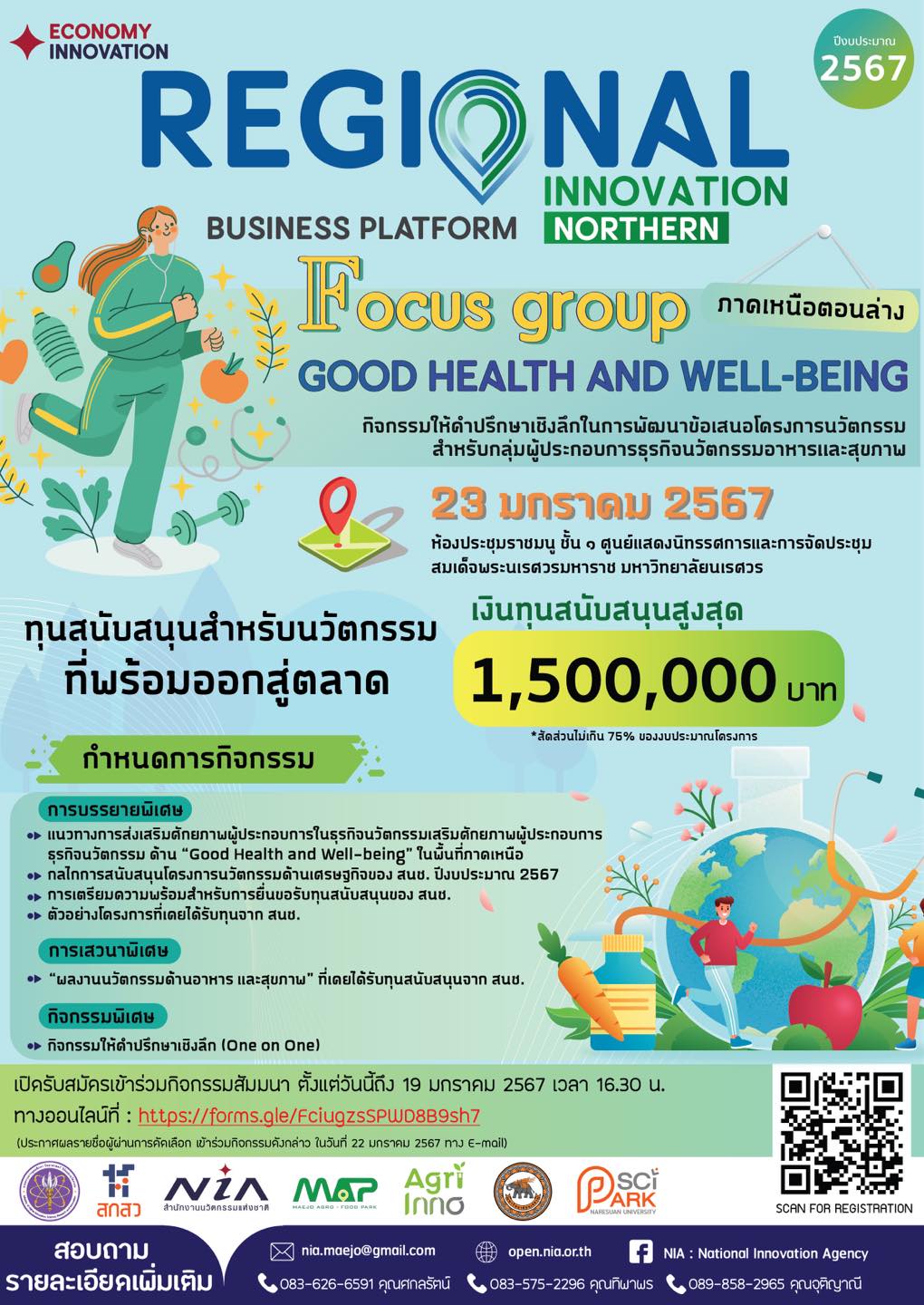 สำนักงานนวัตกรรมแห่งชาติ (NIA) โดย ฝ่ายนวัตกรรมเพื่อเศรษฐกิจ ร่วมกับ เครือข่ายนวัตกรรมด้านเศรษฐกิจศูนย์ความเป็นเลิศด้านนวัตกรรมทางการเกษตรสำหรับบัณฑิตผู้ประกอบการ มหาวิทยาลัยแม่โจั (จ.เชียงใหม่) เชิญชวน ผู้ประกอบการและผู้ที่สนใจ เข้าร่วมกิจกรรม Focus Group : Good Health and Well-being เพื่อรับฟังแนวทางการสนับสนุนผู้ประกอบการ เงินทุนให้เปล่าสูงสุดโครงการละ 1,500,000 บาท