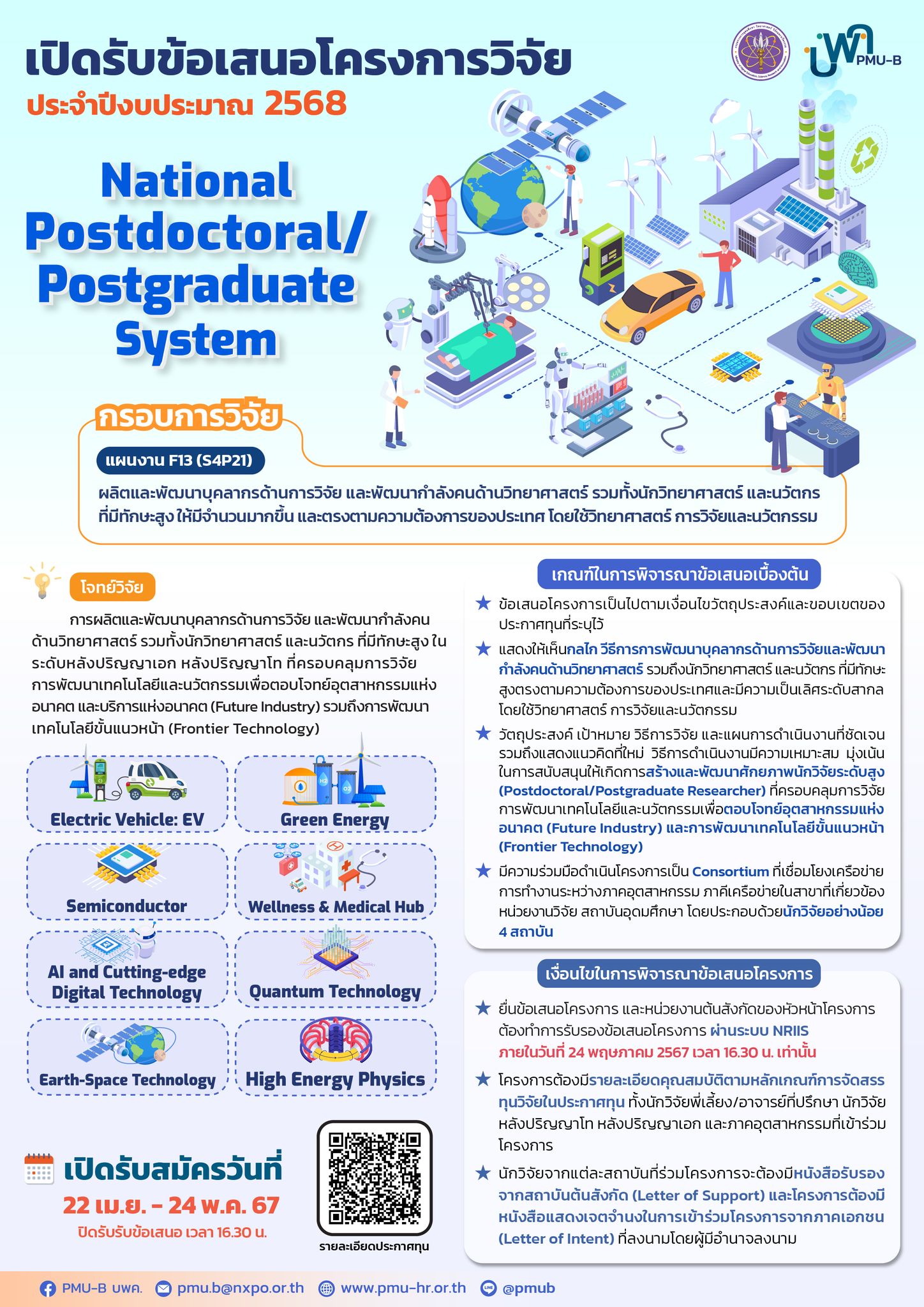 หน่วยบริหารและจัดการทุนด้านการพัฒนากำลังคน และทุนด้านการพัฒนาสถาบันอุดมศึกษา การวิจัยและการสร้างนวัตกรรม (บพค.) เปิดรับข้อเสนอโครงการวิจัยฉบับสมบูรณ์ ประจำปีงบประมาณ 2568 “National Postdoctoral/Postgraduate System”