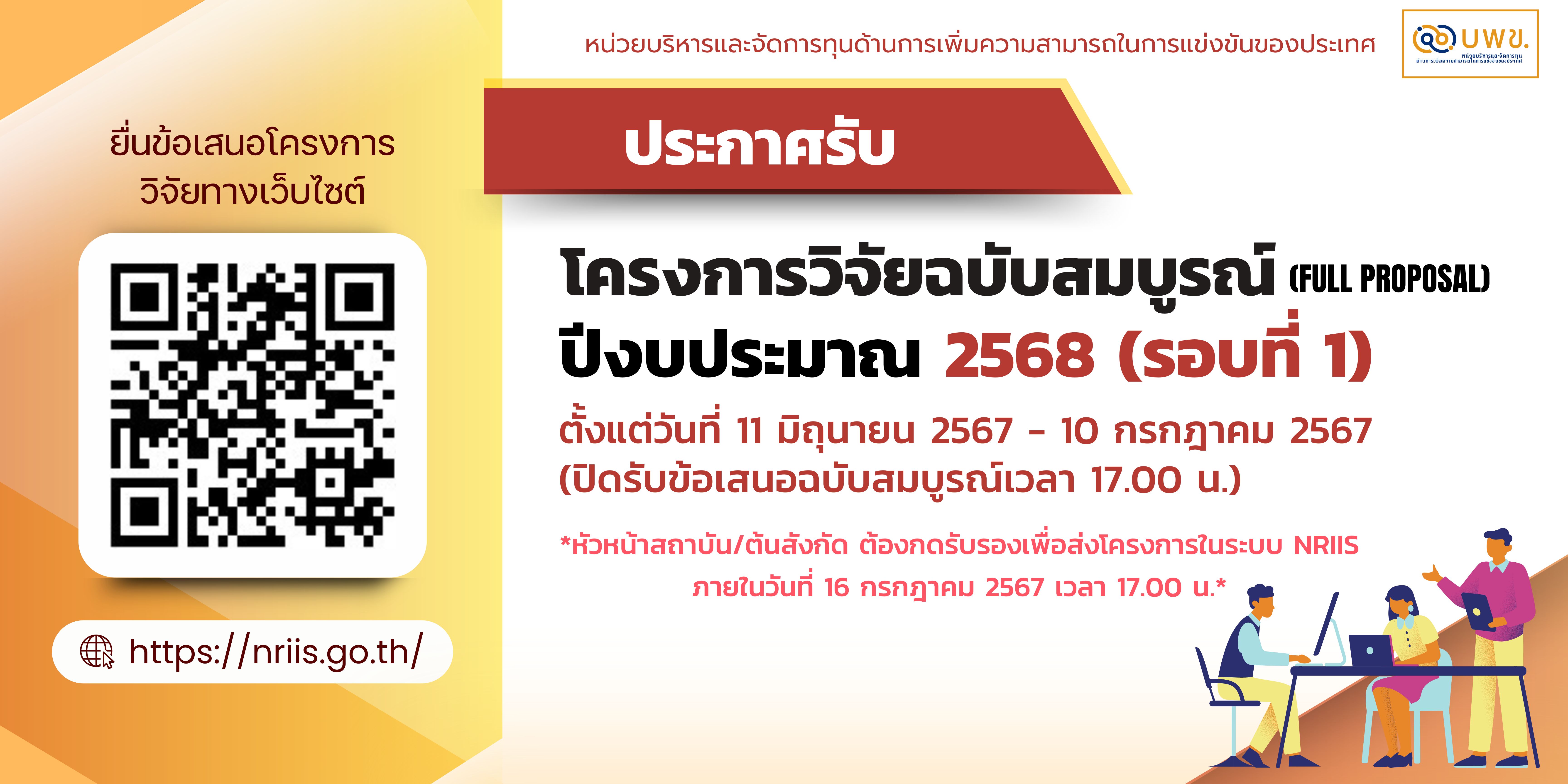 กระทรวงการอุดมศึกษา วิทยาศาสตร์ วิจัยและนวัตกรรม (อว.) โดย หน่วยบริหารและจัดการทุนด้านการเพิ่มความสามารถในการแข่งขันของประเทศ (บพข.) ประกาศรับข้อเสนอโครงการวิจัยฉบับสมบูรณ์ (Full proposal) ประจำปีงบประมาณ 2568 (รอบที่ 1)