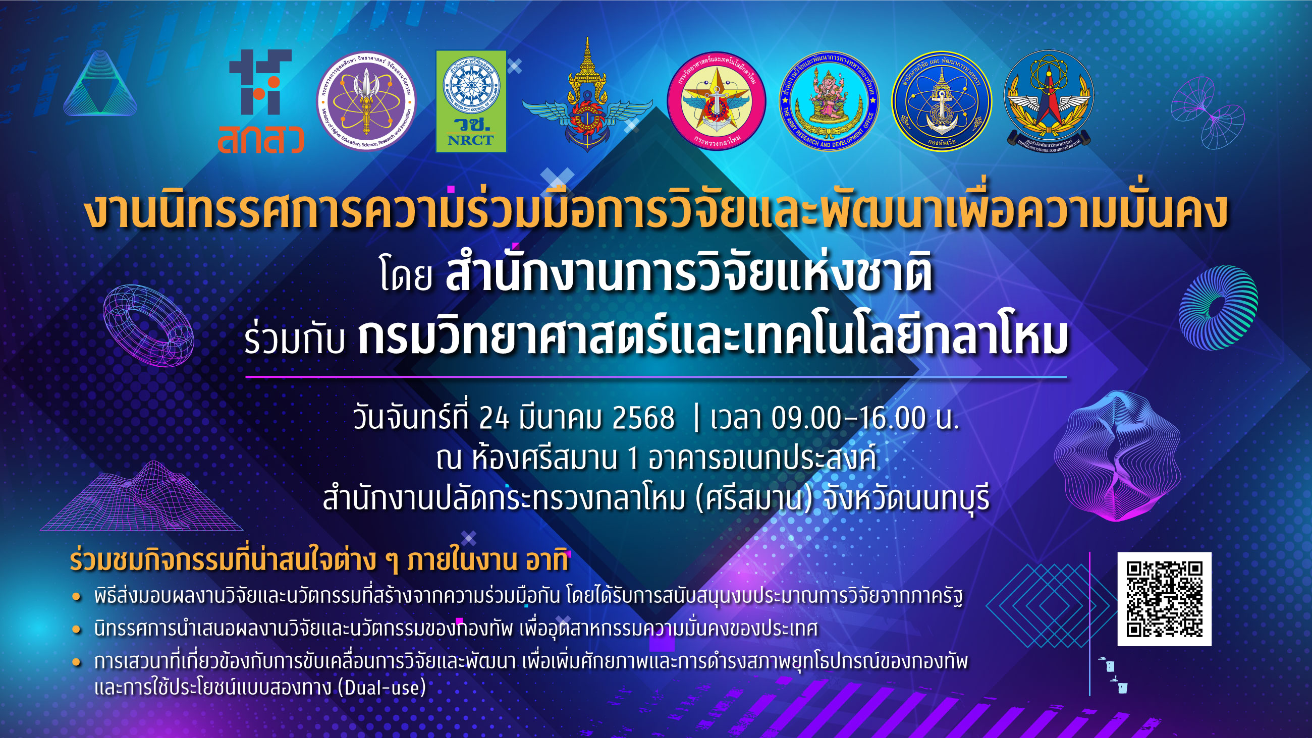 สำนักงานการวิจัยแห่งชาติ (วช.) และกองทัพได้มีความร่วมมือกันในการสนับสนุนงบประมาณ การวิจัยและนวัตกรรมมาต่อเนื่อง เพื่อให้เกิดการพัฒนาอุตสาหกรรมเทคโนโลยีสองทางและความมั่นคง จึงกำหนดจัดงาน “นิทรรศการความร่วมมือการวิจัยและพัฒนาเพื่อความมั่นคง” เพื่อเป็นฟันเฟืองที่ช่วยขับเคลื่อนเศรษฐกิจและความมั่นคงของประเทศ รวมทั้งส่งเสริมการวิจัยและพัฒนายุทโธปกรณ์และยุทธภัณฑ์ทางการทหารไปพร้อมกับอุตสาหกรรมที่เป็นเทคโนโลยีสองทางเพื่อให้เกิดความร่วมมือของหน่วยงานภาครัฐและเอกชนในการผลิต และพัฒนาต่อยอดงานวิจัยสู่การผลิตในเชิงพาณิชย์