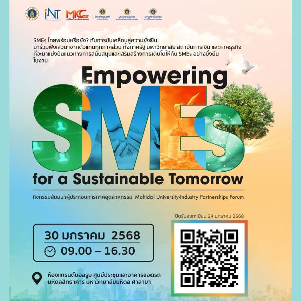 สถาบันบริหารจัดการเทคโนโลยีและนวัตกรรม (iNT) ร่วมกับ วิทยาลัยนานาชาติ คณะสิ่งแวดล้อมและทรัพยากรศาสตร์ และสถาบันวิจัยประชากรและสังคม มหาวิทยาลัยมหิดล ขอเชิญชวนผู้ประกอบการ SMEs ทุกท่านเข้าร่วมงานสัมมนา Mahidol Industry Partnership Forum : Empowering SMEs for a Sustainable Tomorrow ที่จะเปิดโลกทัศน์ใหม่ในการพัฒนาธุรกิจอย่างยั่งยืน รับฟังเสวนาจากผู้เชี่ยวชาญทุกภาคส่วน, สร้างเครือข่ายใหม่ และค้นพบแหล่งทุนที่ช่วยยกระดับธุรกิจให้เติบโตอย่างยั่งยืน