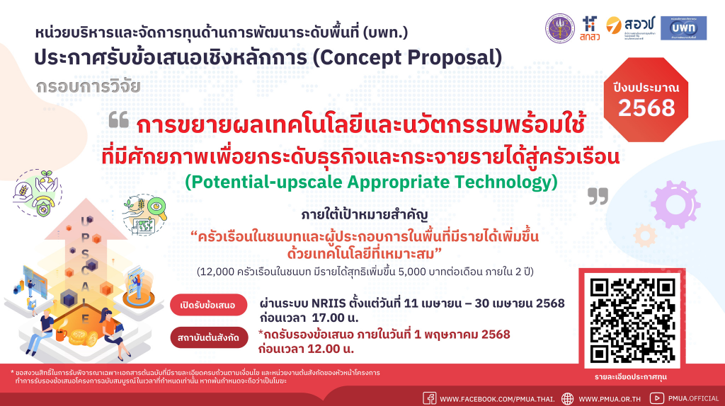 - ระยะเวลาดำเนินงาน: ไม่เกิน 12 เดือน (1 ปี) นับจากวันที่ลงนามในสัญญารับทุน