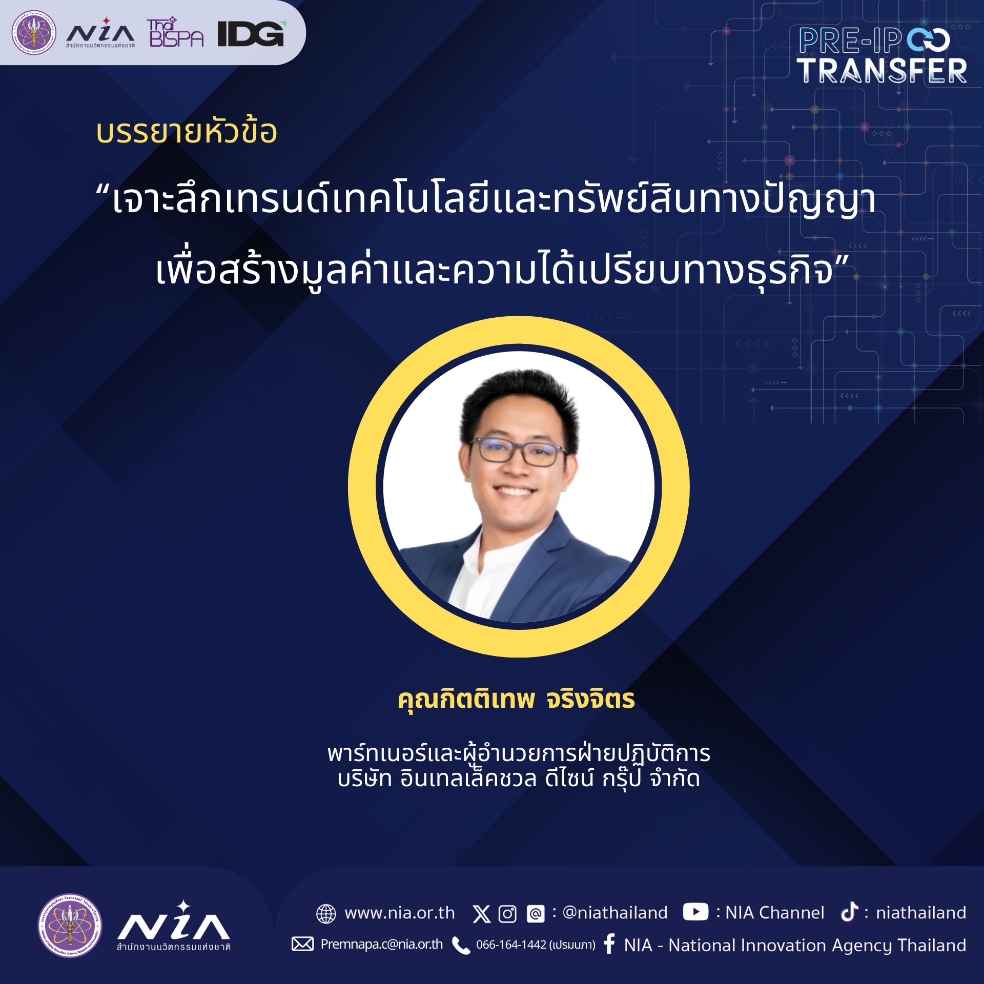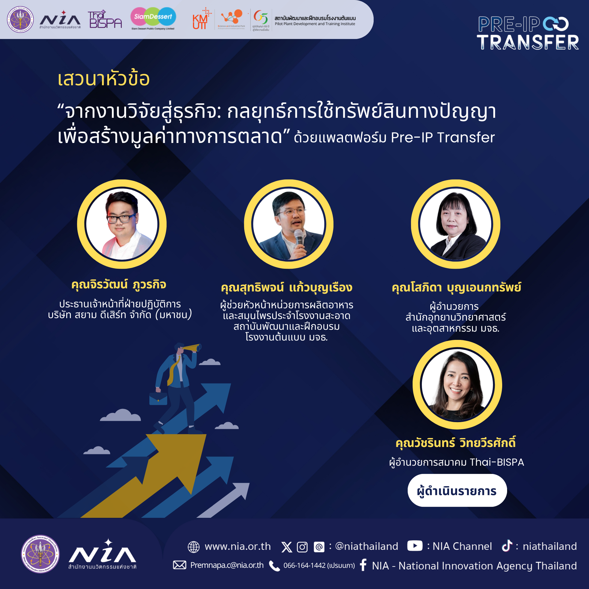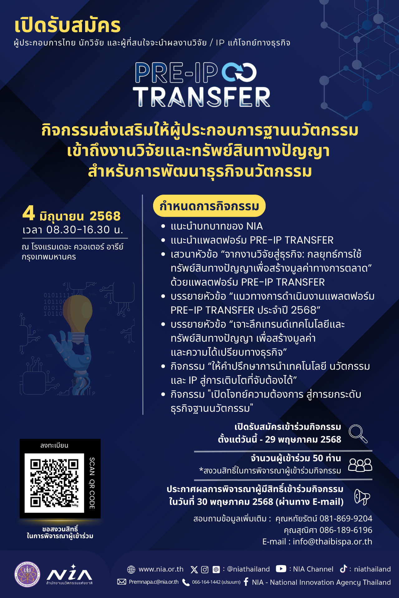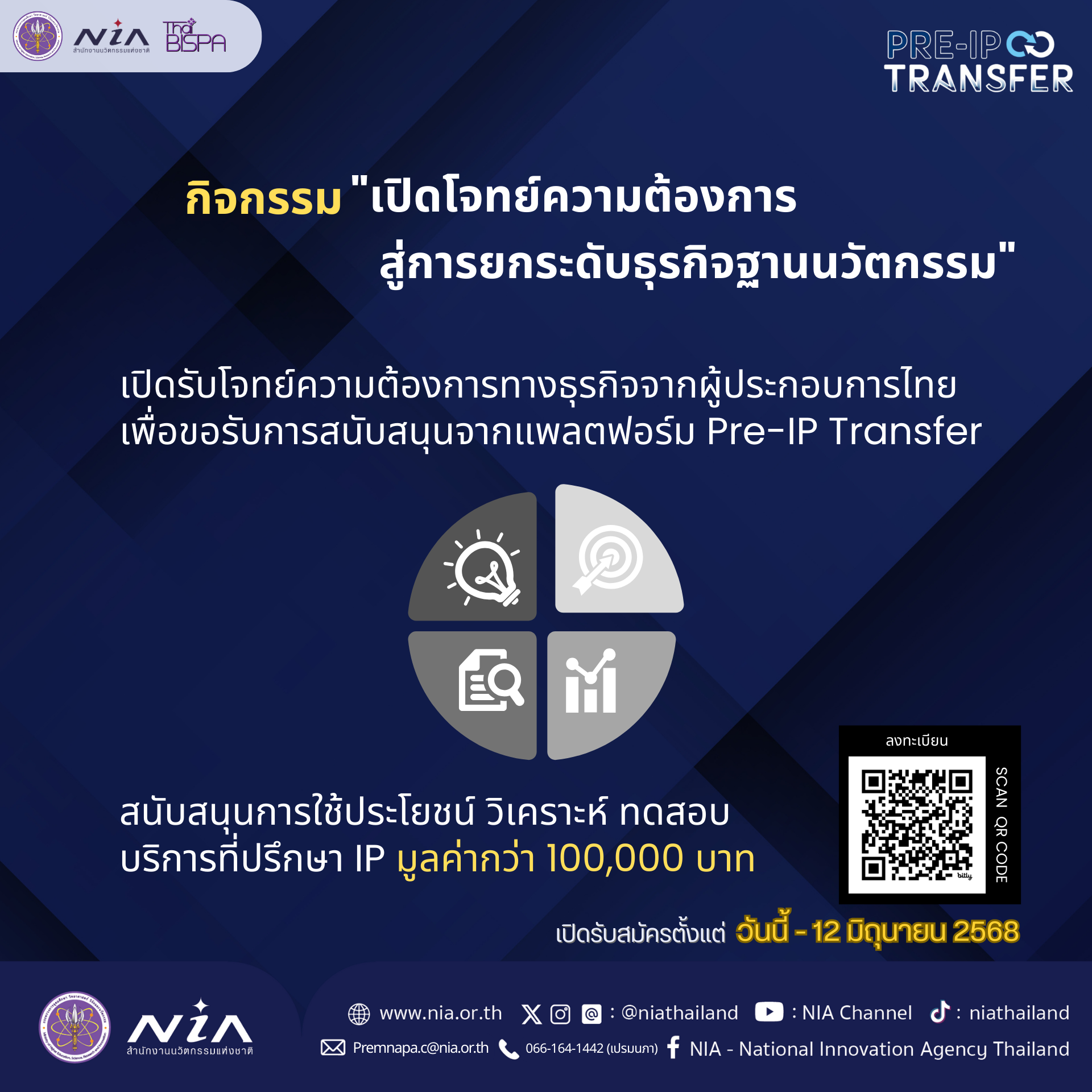 สำนักงานนวัตกรรมแห่งชาติ (องค์การมหาชน) ร่วมกับ Thai-BISPA ขอเชิญเข้าร่วม “กิจกรรมส่งเสริมให้ผู้ประกอบการฐานนวัตกรรมเข้าถึงงานวิจัยและทรัพย์สินทางปัญญา สำหรับการพัฒนาธุรกิจนวัตกรรม” และเสนอโจทย์ความต้องการทางธุรกิจผ่าน แพลตฟอร์ม Pre-IP Transfer